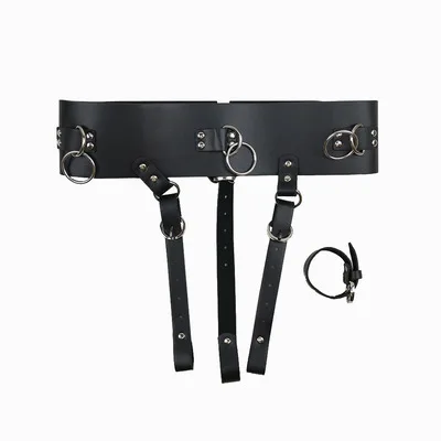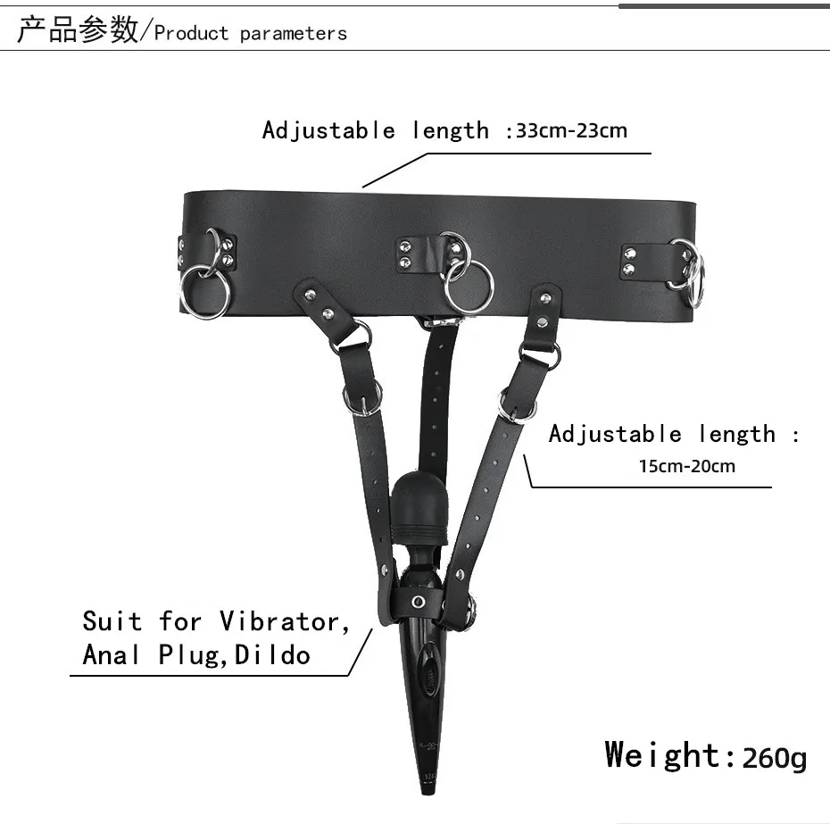 Пояс выполнен из высококачественных из искусственной кожи. Он использует две системы пряжки ремня, чтобы держать его твердым и на месте. На передней части ремня есть три уплотнительных кольца. Передний подвесной держатель предназначен для размещения палочки массажер или вибратор аналогичного размера и формы. Талия регулируется от 68 см до 87 смСпецификация: