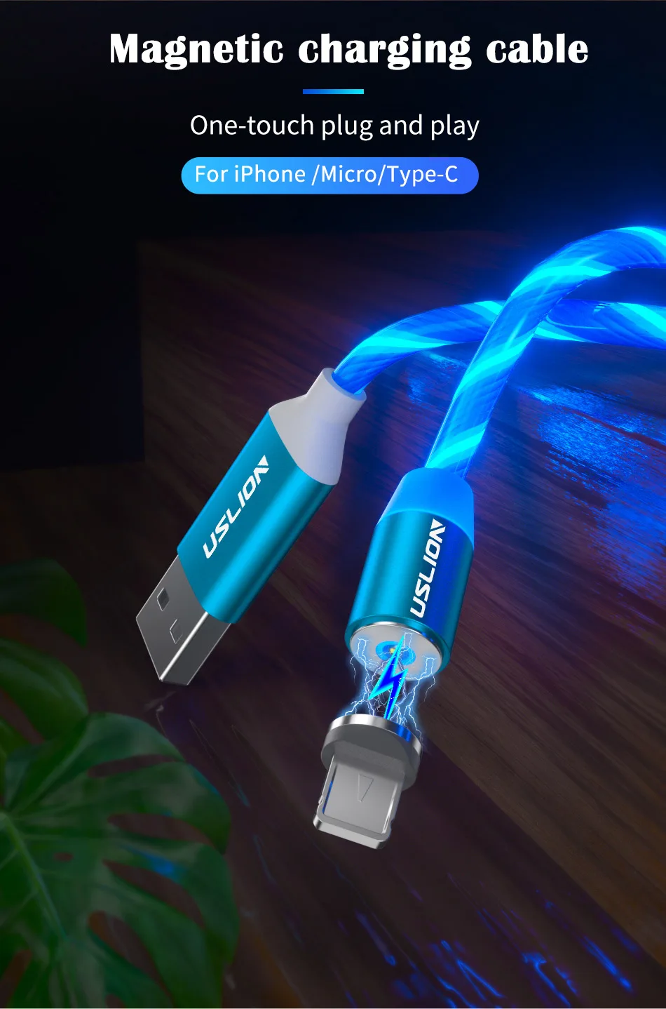 Магнитный зарядный кабель USLION со светодиодной подсветкой, USB Ty...