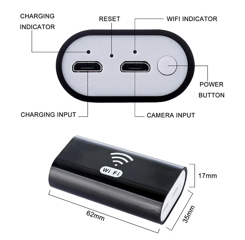 Основная особенность:Новинка и высокое качество2 м пикселей с высоким разрешением CMOS камера, HD 720PБеспроводное подключение Wi-Fi, простое подключение и использованиеМини-размер и светильник для портативного использования8 светодиодных ламп, регулировка яркостиВодонепроницаемая конструкция IP67Совместимость с системой IOS/Android/Windows/MacПоставляется с присоской, легко монтируется в Wi-Fi коробке на задней части телефона или в другом месте с плоской поверхностьюWi-Fi коробка имеет встроенный аккумулятор 800 мАч, может работать в течение 45 минут,Зарядка через мощность 5 ВПоддержка фотосъемки и записи видео на мобильный телефон