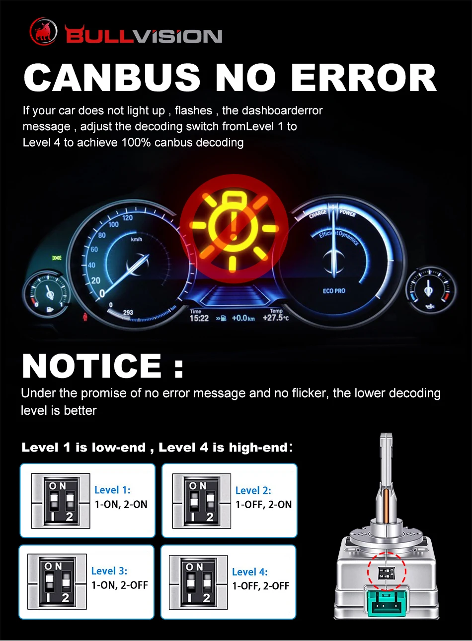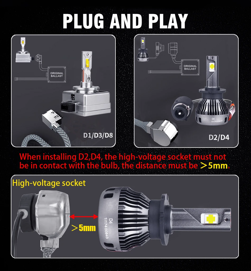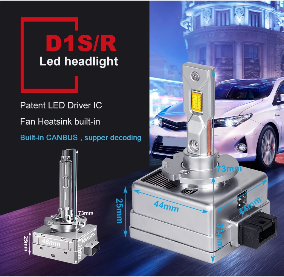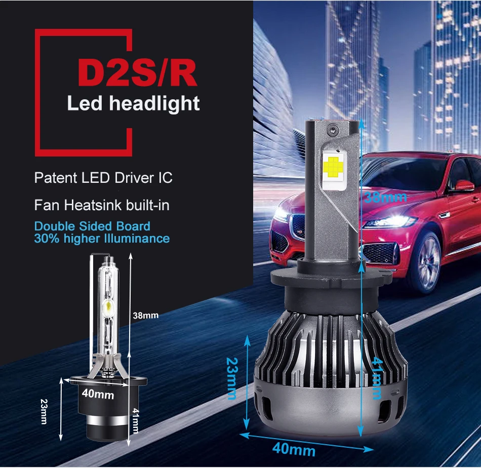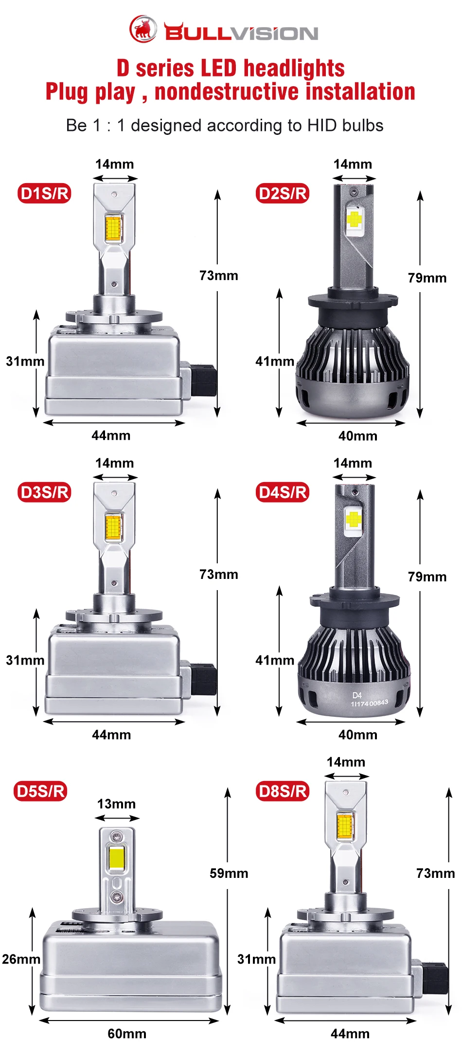 Почему стоит выбрать светодиодный комплект ламп для автомобилей?Хорошо известные HID лампы были оптимальным источником светильник на транспортных средствах с начала 21 века. С появлением технологии светодиодный светильник, улучшенный выход и надежность, светодиодный-это новая альтернатива и замена. Роскошные автомобильные производители, такие как Audi, включают светодиодный светильник в качестве основного источника в своих автомобилях и полностью медленно отказываются от HID.Преимущества продукта:Этот продукт напрямую совместим с оригинальным автомобильным балластом HID. Действительно достигает неразрушающего обновления, не нужно вносить какие-либо изменения в линию, не повреждает оригинальную машину AFS и вспомогательную функцию. 100% декодирование.Высокая яркость, светодиодный Bullvision на 200% ярче, чем оригинальный автомобильный HID;0,01 S является мгновенно яркий, никаких задержек Высокая мощность Зеленая лазерная указка, видеть дорогу состояние раннего;Долгий срок службы, до 50000 часов жизни, в 10 раз больше, чем у HIDИнформация о продуктеНапряжение: 12 ВМощность: 90 Вт/пара L/45 Вт в/45 ВтЛюмен (яркость): 20000LM/пара L/10000LM H/10000LMЦветовая температура (цвет): 6000KСрок службы: >50000 часовЧип: для фирменного чипаУровень водонепроницаемости: IP68Вентилятор: Турбо-высокоскоростной вентиляторОхлаждение сплава: алюминий + вентилятор охлаждения (12000 об/мин)Рабочая температура:-40-90 ℃Гарантия: 2 годаCanbus: С canbusПосылка: 2 лампочки в одной коробкеПредварительная установка lnspection, lmportant вопросы:1. Этот продукт подходит только для модернизации оригинального автомобиля с функцией ксеноновой лампы HID. Не подходит для обновления модели галогенной лампы.2. В настоящее время Доступные модели: D1S/D1R/D2S/D2R/D3S/D3R/D4S/D4R/D5S/D8S3. Убедитесь, что HID балласт оригинального автомобиля может работать должным образом