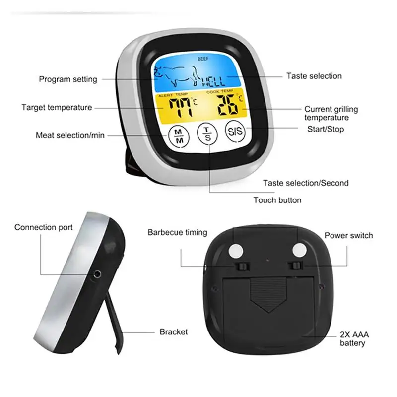 Сенсорный экран термометр для мяса может установить температуру, чтобы идеально готовить все виды мяса и других продуктов питания.