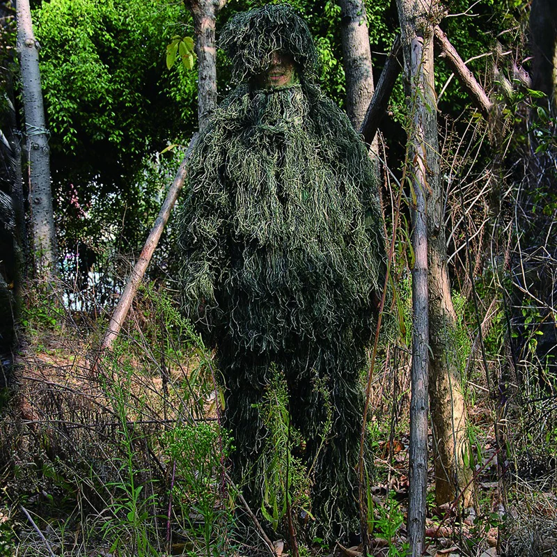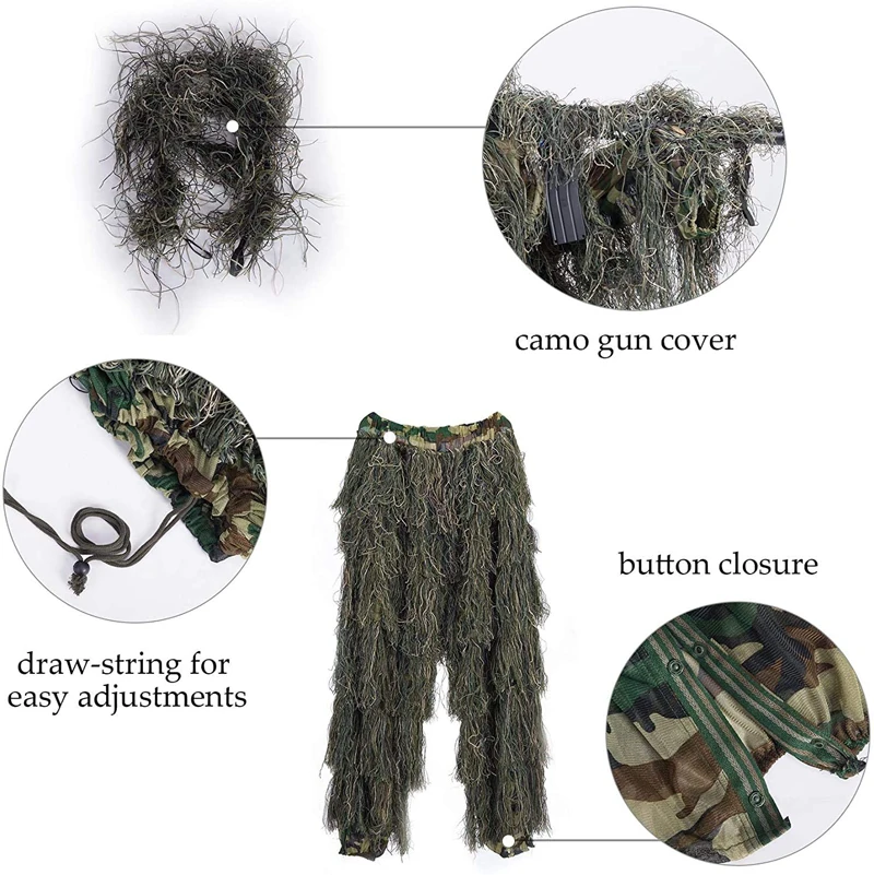 1. Эластичный пояс на брюках для легкой регулировки размера 2. Попперс на куртке позволяет легко надевать и снимать 3. Свободный размер, подходит для всех мужчин и женщин 4. Вы можете носить этот костюм внутри и снаружи в соответствии с вашими потребностями 5. Регулируемый размер крышки с помощью ремня, может эффективно замаскировать вашу голову 6. Ручная стирка, легкий, подходит для военных игр и маскировки снайперов 7. Идеально подходит для охоты, стрельбы, дикой природы, охоты, кропотливости, наблюдения, фотографирования дикой природы, наблюдения за птицами и т. д.
