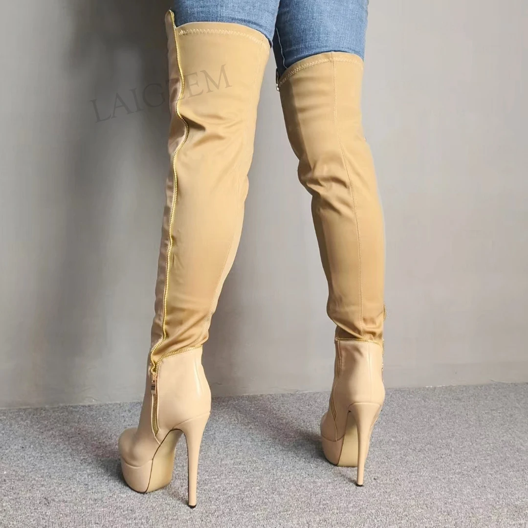 BERZIMER Женские Сапоги выше колена на молнии со шнуровкой на платформе и высоком каблуке, с широким бортиком, FriendlyStretchy обувь для девушек, большой Размеры 41-44 46 50 52