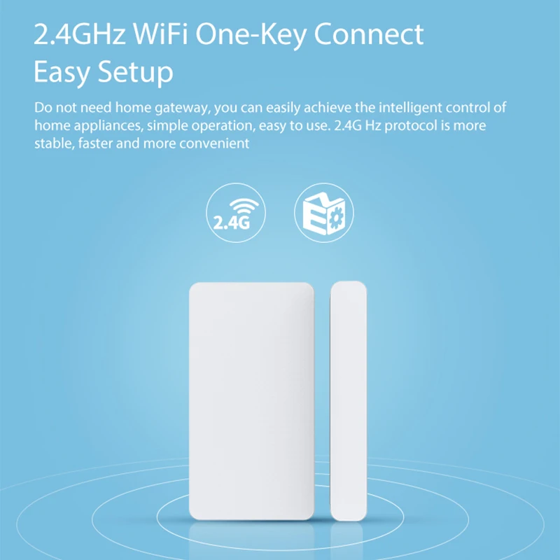 Название продукта: дверной датчик Wi-Fi Тип батареи: AA LR6 1,5 V * 2 шт Ток: открытый: 28.4uA Закрытие: 28.1uA Ток триггера: 43ма Ток сопряжения: 37 мА Время работы: 4000 раз Рабочая температура: 0 ℃ ~ 40 ℃ (32 °F ~ 104 °F) Рабочая влажность: 20% ~ 85% Температура хранения: 0 ℃ ~ 60 ℃ (32 °F ~ 140 °F) Влажность хранения: 0% ~ 90% Беспроводной Тип: 2,4 ГГц Стандарт беспроводной связи: IEEE 802.11b/g/n Беспроводной диапазон: 35 м Вес (без батареи):53 г Размер: основной корпус: 82 мм x 42 мм x 16 мм Маленький корпус: 82 мм x 11 мм x 18 мм