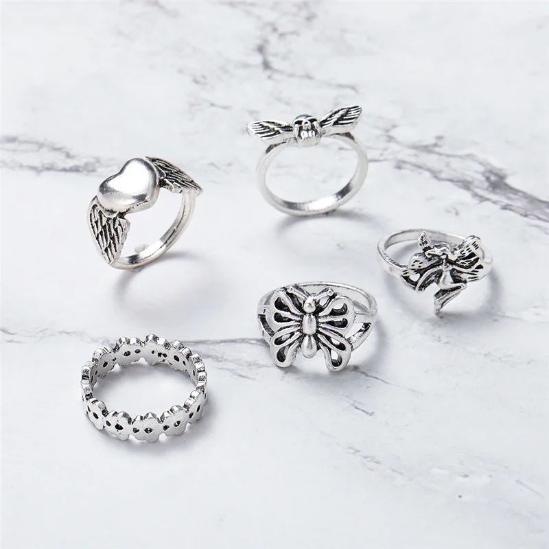 Винтажные посеребренные кольца кольцо с крыльями ангела для женщин, Наборы украшений для вечеринок в стиле готика, панк, стимпанк, сердца, бабочки, черепа, 2021
