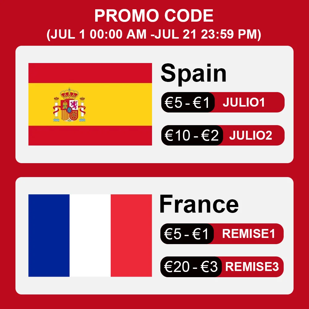Испания супер код:1 скидка на заказы свыше 5 евро код копии:JULIO12 скидки на заказы свыше 10 евро код копии:JULIO2Копия кода Франции:1 скидка на заказы свыше 5 евро код копии:REMISE11 скидка на заказы свыше 5 евро код копии:REMISE3ПрименениеИнструкции: СкопируйтеСоответствующийКод