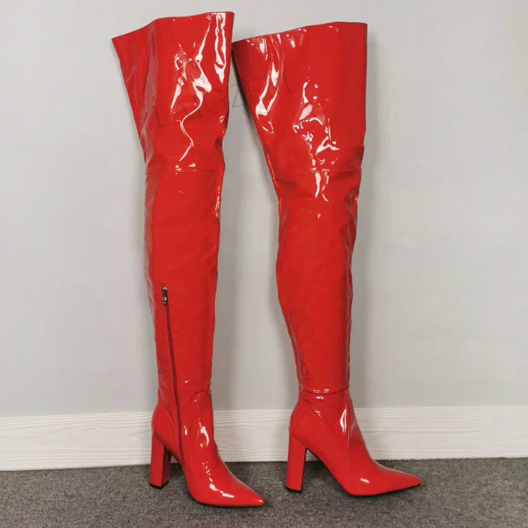 SEIIHEM/женские высокие сапоги с острым носком на массивном высоком каблуке с боковой молнией; Блестящие красные и черные сапоги до бедра; Женская обувь; Большие размеры 40, 42, 47