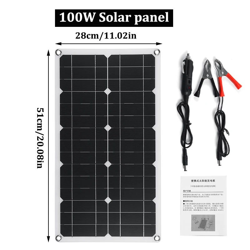 ● Солнечная панель мощностью 100 Вт:Характеристики панели:-Максимальная мощность: 100 ВтТехнический анализ Vpmax: 18V-Выходное напряжение: USB5V + DC18V-Выходной ток: 25A, 10A-Аккумулятор: монокристаллический-Материал: EVA + PET-Размер панели: 510x280x3,0 мм/20.08x11.02x0.12 дюймовПосылка включает в себя:1 панель солнечных батарей1x крокодил1 автомобильное зарядное устройство