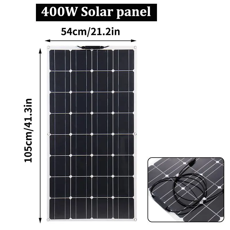 ● 400 Вт солнечная панель:Характеристики панели:-Максимальная мощность: 400 Вт-Технический анализ Vpmax: 18 в-Выходное напряжение: USB12V + DC18V-Выходной ток: 25A, 30A-Аккумулятор: монокристаллический-Материал: EVA + PET-Размер панели: 1050 мм * 540 мм * 2,5 мм/41.3inx21.3inx0.1inПосылка включает в себя:-1 x Панель 400 Вт (включая герметичный разъем)