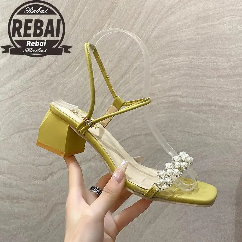 Модные женские сандалии на квадратном каблуке с кристаллами и жемчу...