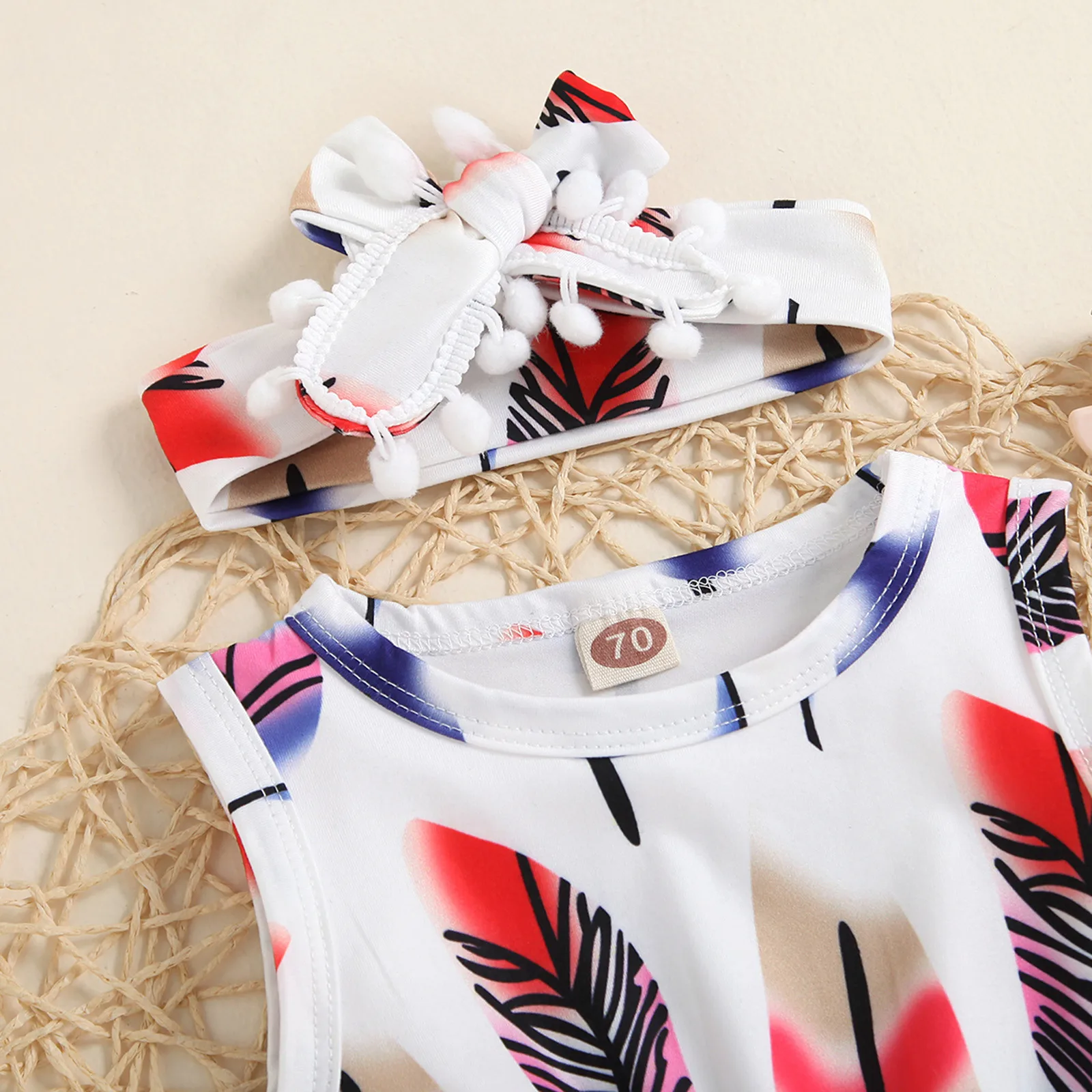 Боди для девочек, с принтом в виде перьев, без рукавов, с кисточками, лето наборы повязок на голову, комплект одежды для новорожденных