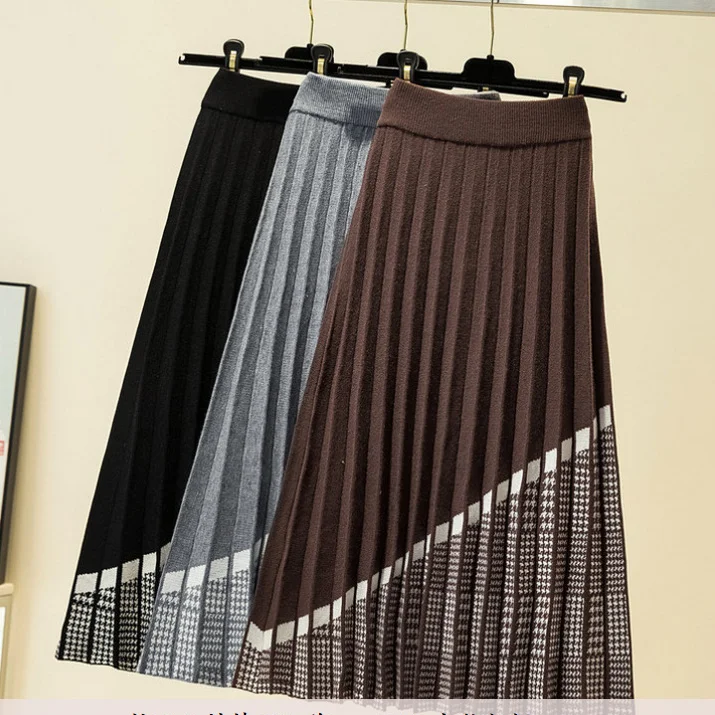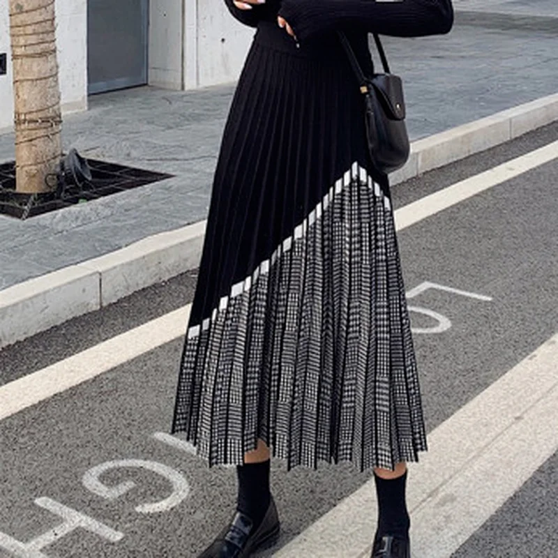 Длинная вязаная женская плиссированная клетчатая юбка, Осень-зима, ...