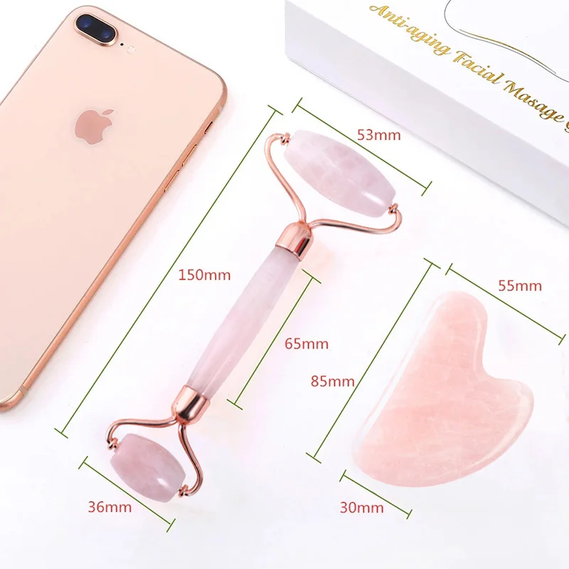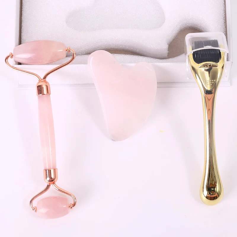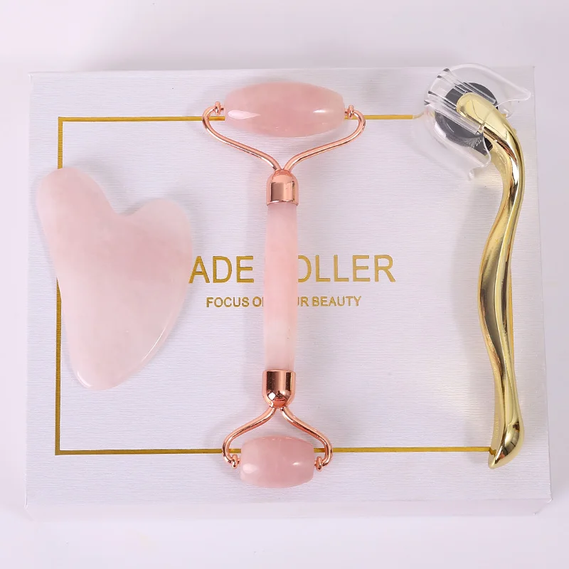 Натуральный камень нефритовый роликовый лицевой массажер микроиглы ролик нефритовый шпатель уход за кожей из трех частей розовый КВАРЦЕВЫЙ роликовый массажер инструмент
