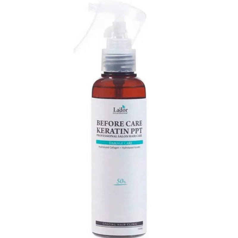 La’dor BEFOR CARE KERATIN PPT - Кератиновый спрей для питания, защиты и разглаживания волос во время окрашивания и химической завивки. Средство наносится непосредственно перед процедурой и надежно защищает локоны от разрушающих воздействий, помогая сохранить целостность волосяного стрежня. Спрей не только предотвращает повреждения, но и восстанавливает структуру волос, заполняя пустоты в структуре, «склеивая» кончики, придавая локонам эластичность, прочность и дополнительный объём. Используйте продукт перед каждым окрашиванием и завивкой, чтобы волосы выглядели «живыми» и блестящими, легко расчесывались и укладывались. Если ваши волосы очень ломкие, хрупкие или сильно повреждены, применяйте средство после мытья головы для быстрого восстановления поврежденных участков. Кератиновый спрей подходит для всех типов волос.