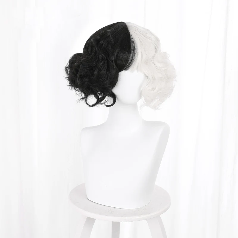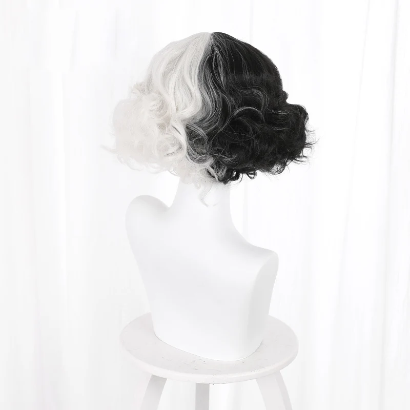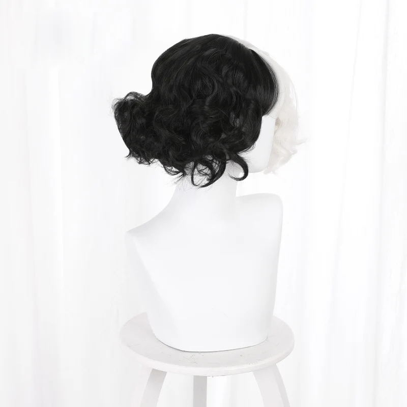 Парик для косплея CRUELLA de Vil, термостойкий, с короткими вьющимися черно-белыми волосами в горошек, с шапочкой