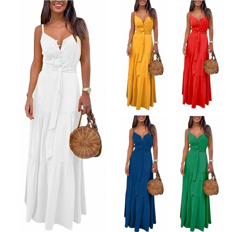 Женское сексуальное длинное платье на бретельках, однотонное персонализированное платье на пуговицах с V-образным вырезом и шнуровкой, офисное женское повседневное свободное Макси-платье большого размера