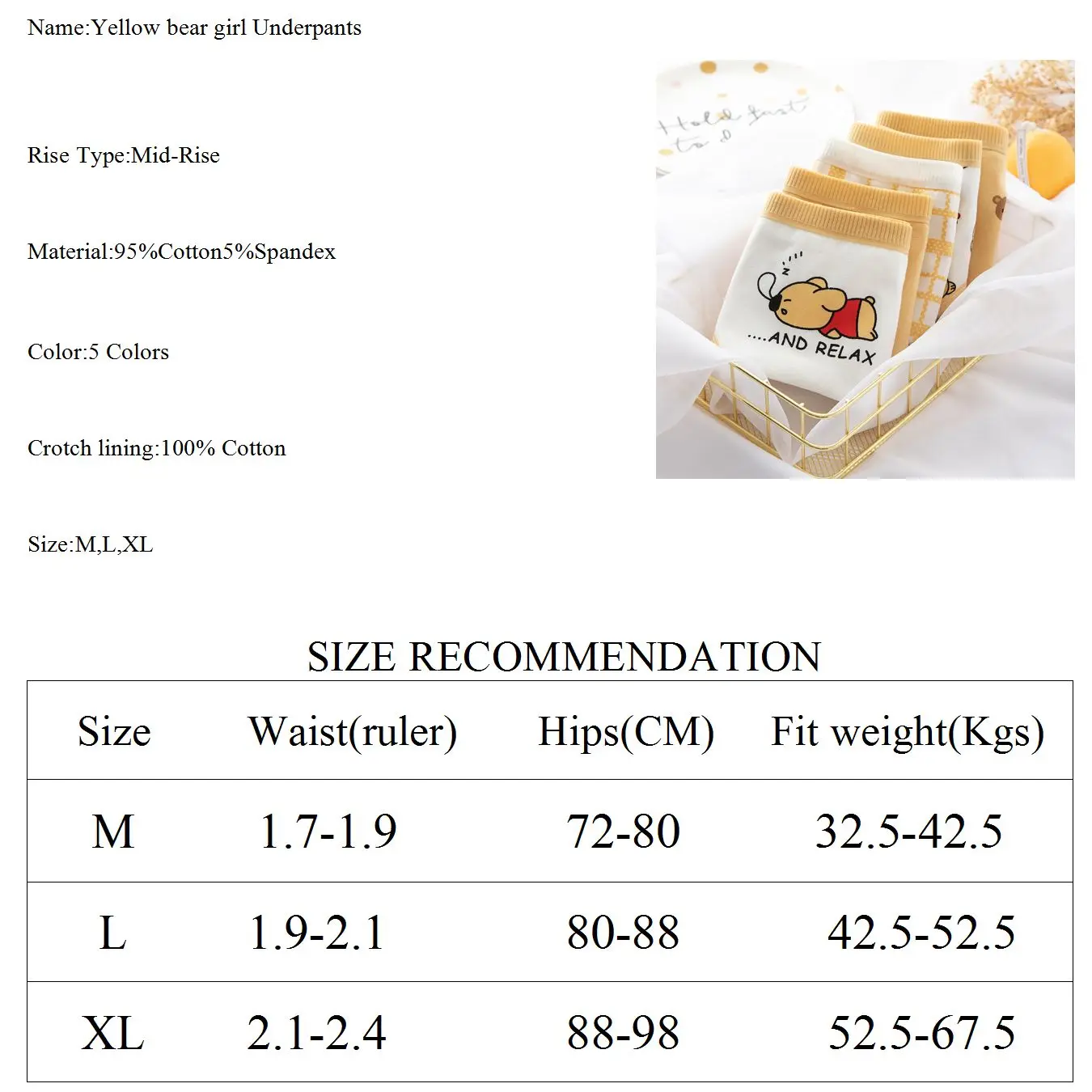 Бренд: AnewmornНазвание: Хлопковые женские трусики с принтом медведяТип подъема: СреднийМатериал: 95% хлопок, спандексЦвет: 5 цветовПодкладка в промежности: 100% хлопокРазмер: M, L,XLРисунок: принт медведяУпаковка: 1 шт./упак.Особенности дизайна: принт, кружевной крайОсобенности: стереотип, дышащий, живот, Подтяжка животаПримечание1. Допускается небольшое отклонение в измерениях.2. Из-за разницы светильник щении и экранах цвет изделия может немного отличаться от изображения, спасибо за понимание.