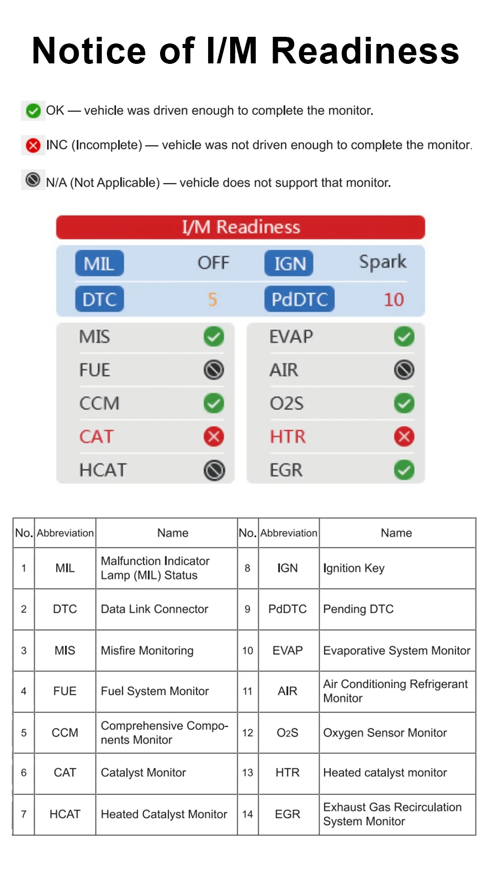 Уведомление о готовности I/M:* Чтобы проверить состояние готовности I/M, убедитесь, что ключ зажигания включен при выключенном двигателе.* Не Все мониторы поддерживаются всеми автомобилями. Есть два типа испытаний на готовность l/M:* Так как коды неисправности очищены-показывает статус мониторов, так как коды неисправности были очищены.* Этот цикл привода-показывает состояние мониторов с начала цикла текущего привода.