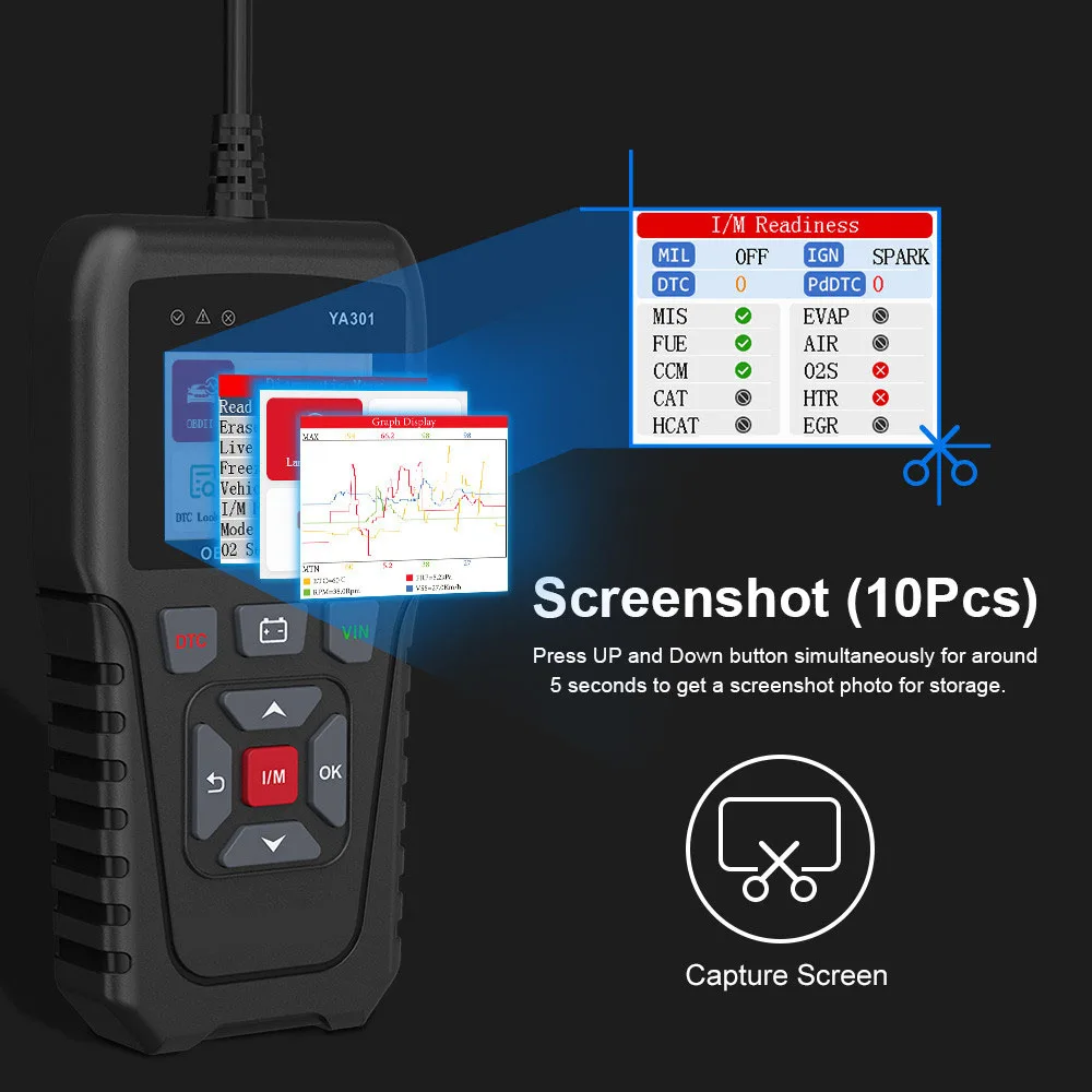Считыватель кодов obdresources YA301 12 В поддерживает функции OBD2 (для системы двигателя), в том числе:Считывание кодовПокажите подробное описание диагностического кода неисправности (коды неисправности)Стирание кодов и сбросОтключает ламсветильник проверки двигателя (MIL), очищает коды и сбрасывает мониторы.Поток данныхСчитывает и отображает поток данных ECU/PCM в реальном времени, а также сохраняет данные стоп-кадра.Состояние готовности I/MПоказывает, правильно ли работают различные системы, связанные с выбросами, на транспортном средстве и готовы ли они к проверке и техническому обслуживанию.Чтение потока данных в реальном времениОтображение информации о непрерывном потоке данных от автомобиля на графическом дисплее в реальном времени (форма волны).Просмотр данных стоп-кадраПроверьте определенные условия транспортного средства, которые регистрируются бортовым компьютером в момент возникновения неисправности, связанной с выбросами.Тест датчика O2Позволяет извлечь и просмотреть результаты тестирования монитора датчика O2 для последних выполненных тестов с бортового компьютера автомобиля.Тест бортового монитораИзвлекает и отображает результаты тестирования компонентов и систем трансмиссии, связанных с выбросами.Читать информацию об автомобилеОтображение такой информации, как VIN (идентификационный номер транспортного средства), CID (идентификатор калибровки) и CVN (номер проверки калибровки) и т. д.Тест компонентовНекоторые компоненты автомобиля могут быть активированы командами, отправленными со сканера для проверки их работоспособности