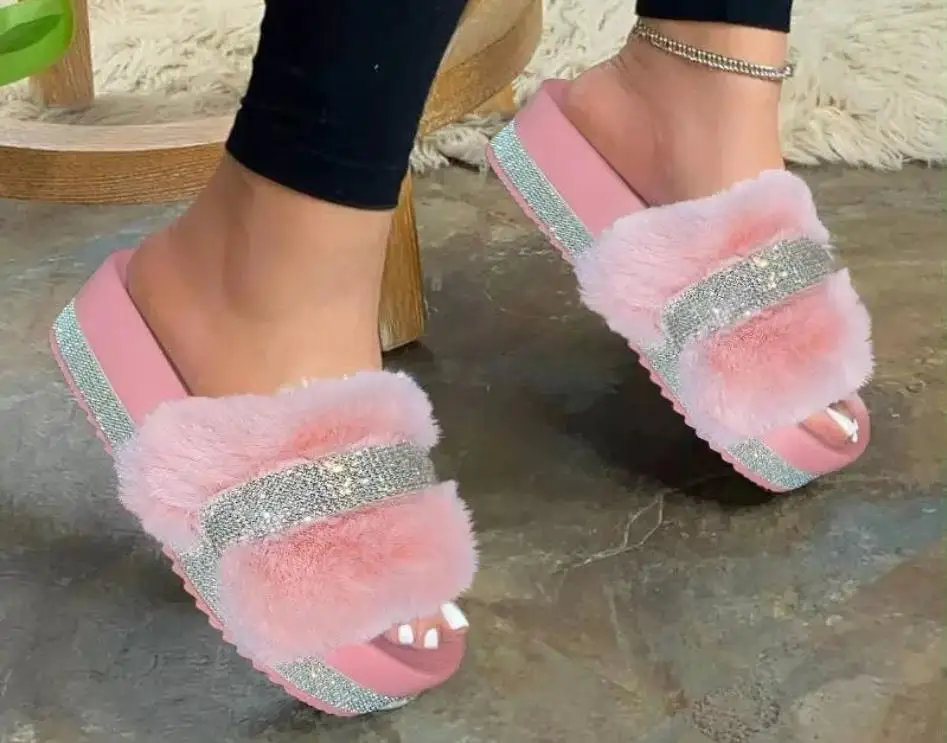 Летние Тапочки пушистые меховые супер мягкое основание пористой подошве стразы; Вьетнамки; Пикантная женская обувь