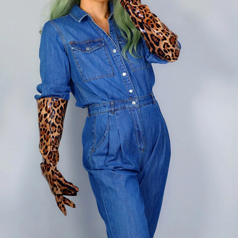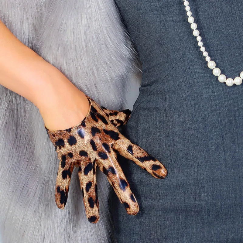 Женские Длинные латексные перчатки с леопардовым принтом, перчатки из искусственной блестящей лакированной кожи, свободные женские перчатки из искусственной кожи с леопардовым Ягуаром