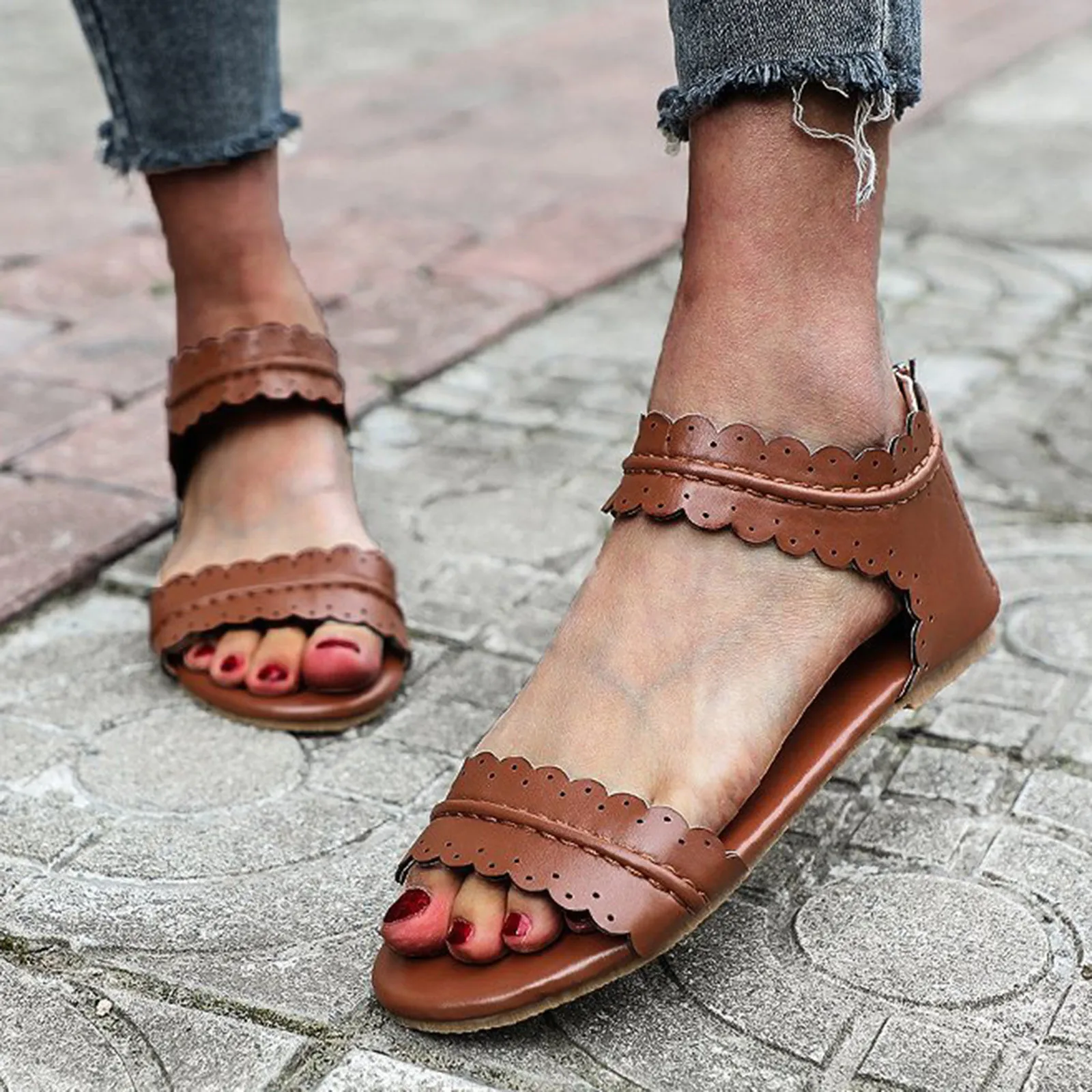 Женские летние однотонные повседневные винтажные сандалии на плоской подошве с открытым носком на молнии