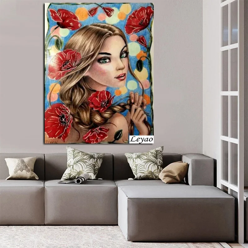 Алмазная живопись, красные цветы, девушка, вышивка крестиком, алмаз...