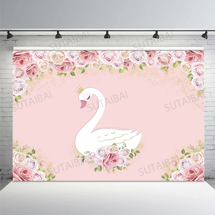Белый лебедь День Рождения Вечеринка фон розовые цветы Золотая Корона девочка принцесса малыш Баннер фотография фон украшение