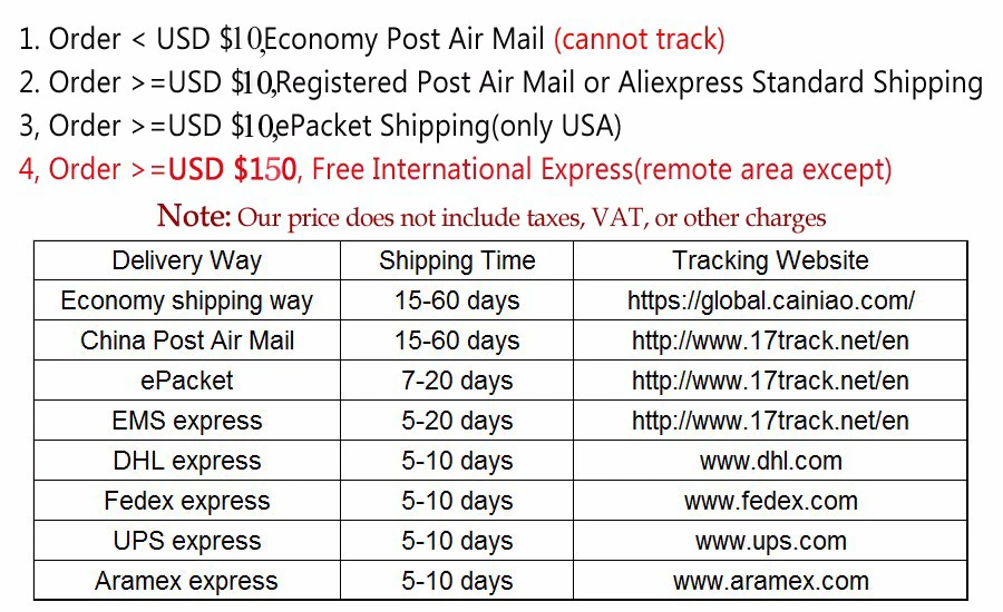 1. Если стоимость заказа превышает $10, товары будут доставлены бесплатно заказной авиапочтой Почта Китая или Epackt