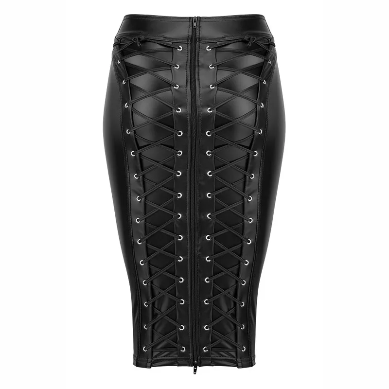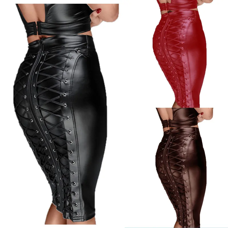 Черный, красный 2XL женская обувь по колено с мокрым эффектом стимпанк из искусственной кожи юбка и на шнуровке; Сандалии на молнии сексапильное облегающее Искусственная кожа Юбки