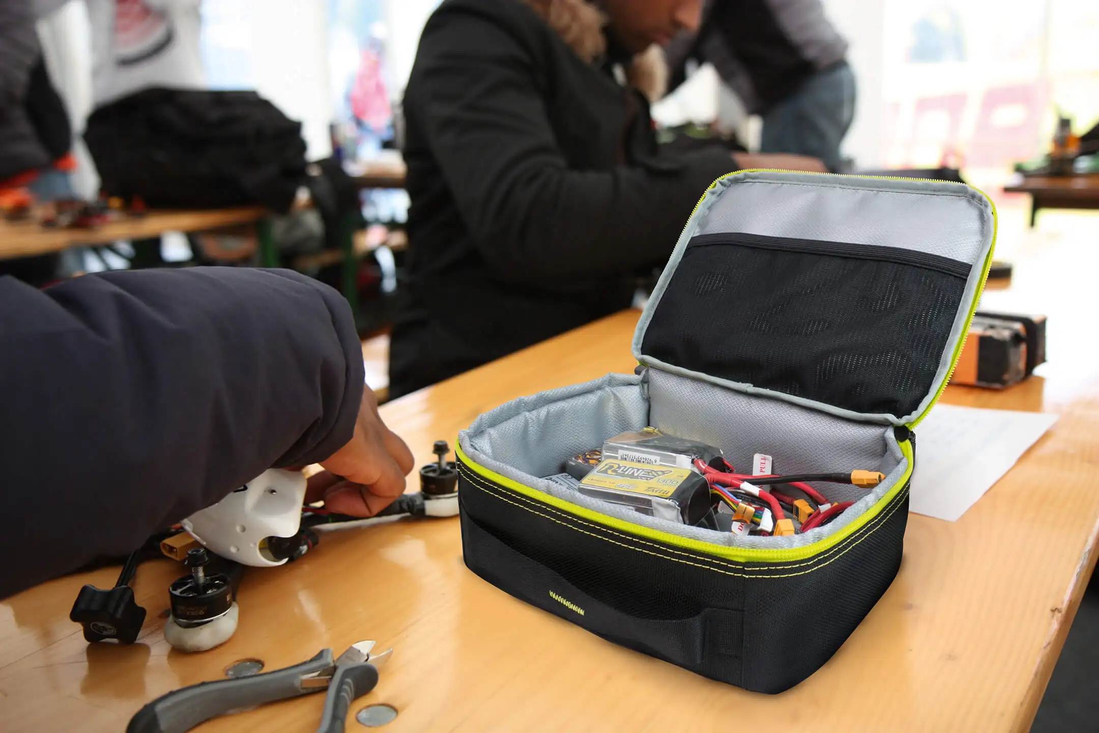 Защитный мешок Torvol lipo изготовлен из высококачественной огнезащитной ткани и обработанной полиэфирной оболочки, поэтому вы можете носить с собой батарею LiPo, где бы вы ни хотели играть, что является безопасным и удобным.