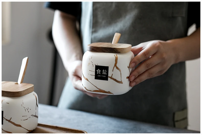 Набор керамических емкостей для приправ, роскошный набор в скандинавском стиле с мраморным узором, деревянное покрытие, шейкер для соли, аксессуары для банок для специй