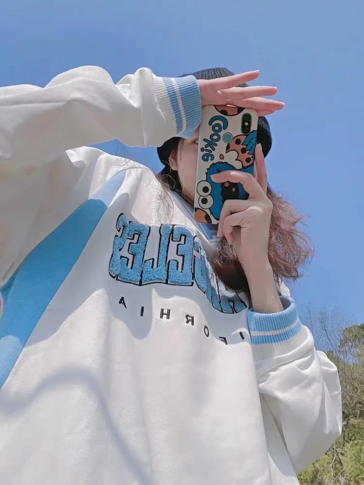 Новинка, Женская толстовка, ретро-худи, Женская толстовка с вышивкой, Harajuku, с V-образным вырезом, размера плюс, свободная толстовка для пары, рубашка с длинными рукавами