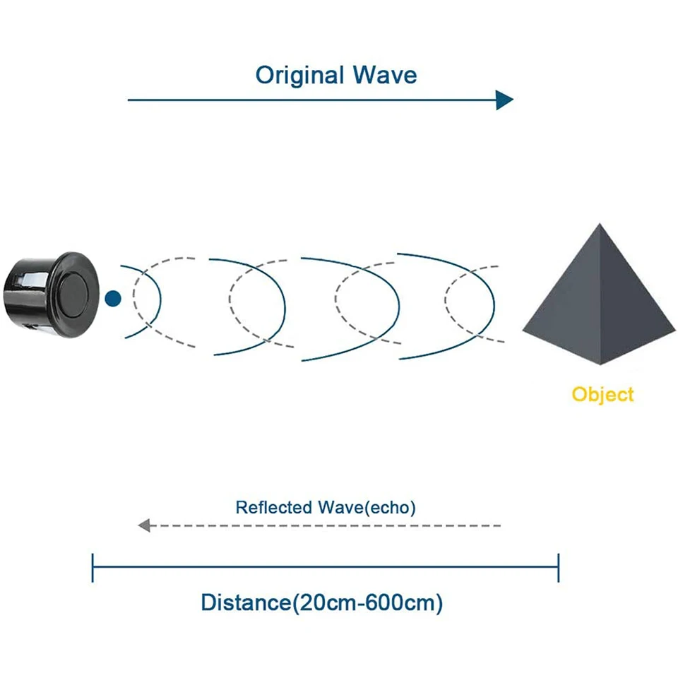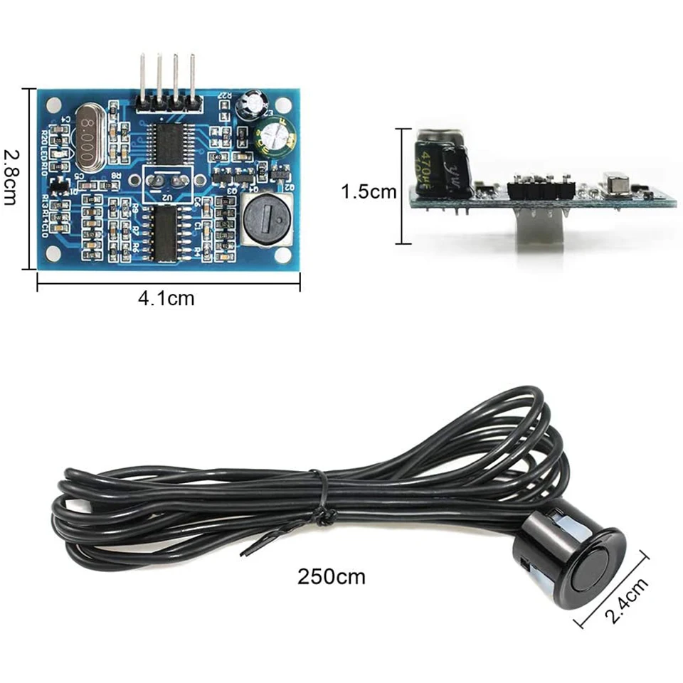 Особенности продукта:1. Маленький размер, прост в использовании2. Низкое напряжение, низкое энергопотребление3. Высокая точность4. Сильная защита от помех5. Интегрированный с проводом Закрытый водонепроницаемый зонд, подходит для влажных, жестких случаев измерения.Применение:1. Измерение расстояния по горизонтали2. Предотвращение препятствий, автоматическое управление3. Когда объект близок, он может быть воспринят4. Контроль движения5. Безопасность, Промышленный контроль6. Искусственный интеллект и исследованияОсновной принцип работы:(1) Используйте порт IO TRIG для запуска диапазона, давая минимум 10us сигнала высокого уровня.(2) модуль автоматически посылает восемь квадратных волн 40 кГц, чтобы автоматически определить, есть ли возврат сигнала.(3) расстояние может быть рассчитано на интервал между запуском сигнала и получением эхо-сигнала.Испытательное расстояние = (высокое время * скорость звука (340 м/с) /2Технические параметры:Рабочее напряжение: 5 В постоянного токаРабочий ток: <8 мАЧастота акустического излучения: 40 кГцДальнее расстояние: 600 смБлижайшее расстояние: 20 смТочность расстояния: ± 1 смРазрешение: около 1 ммУгол: 120 градусовВходной сигнал триггера: 1.TTL Пульс более 10uS; 2. Последовательный порт отправляет инструкцию 0X55Выходной эхо-сигнал: выходной сигнал уровня ширины импульса или TTL.Рабочая температура: -20 ℃ - + 70 ℃Размер модуля: 42 мм * 29 мм * 12 ммПроводное Соединение:1. 5 в (положительный источник питания)2. Trig (Контрольная площадка) RX3. Эхо (выходной конец) TX4. GND (отрицательный источник питания)Посылка включает в себя:1 x Ультразвуковой Модуль расстояния1 x зонд с 2,5 м кабель