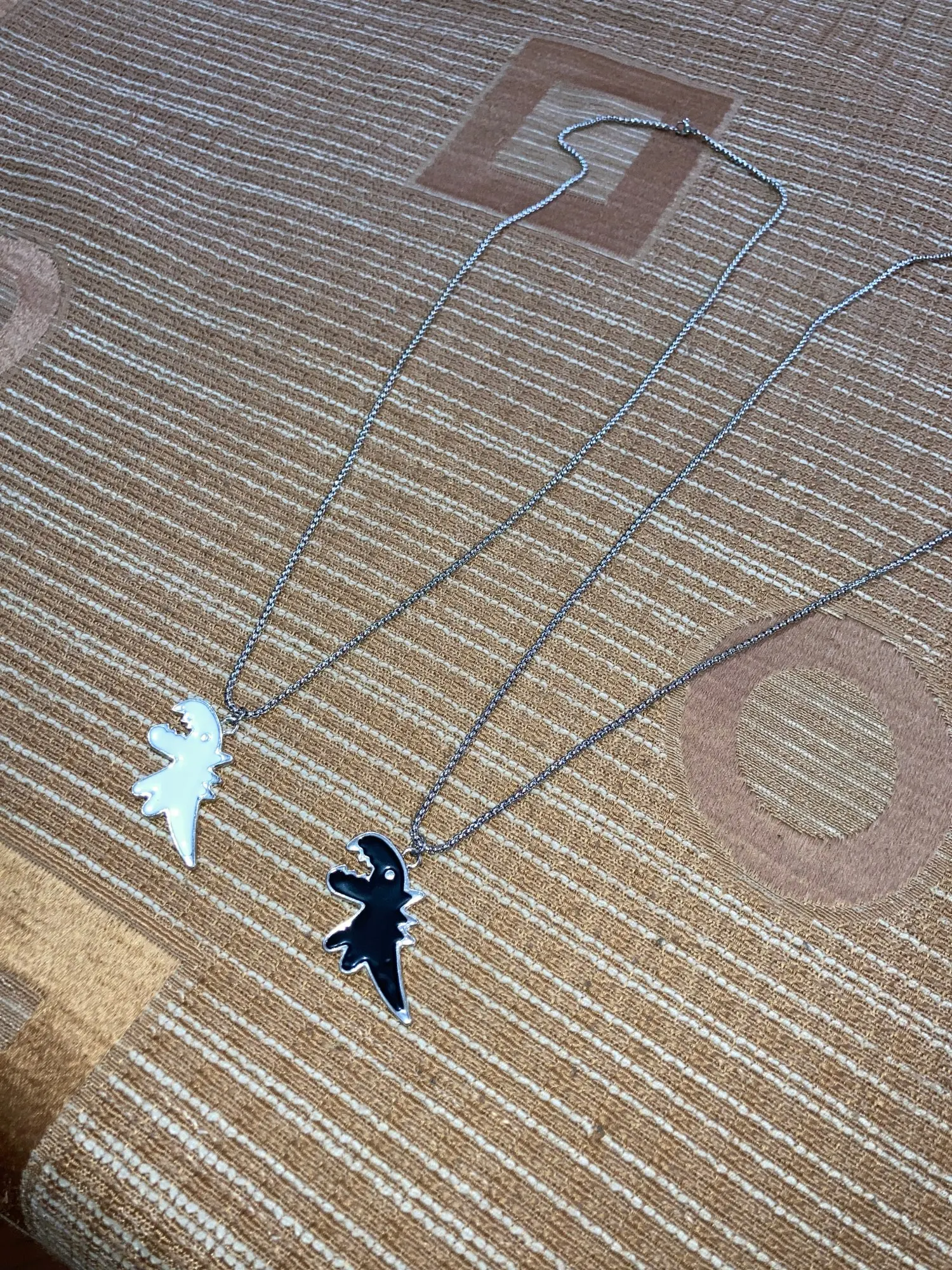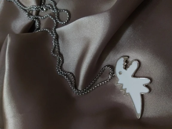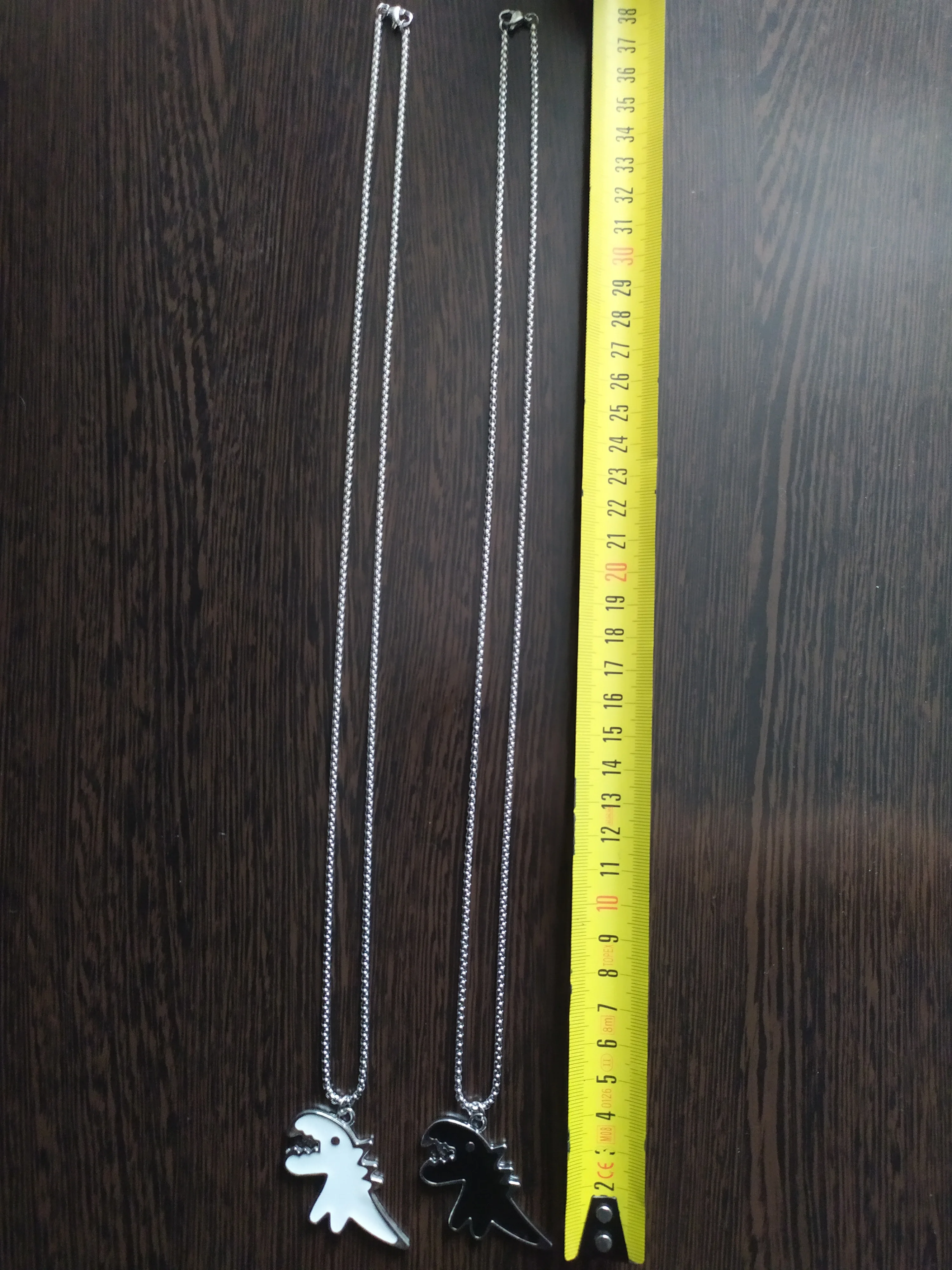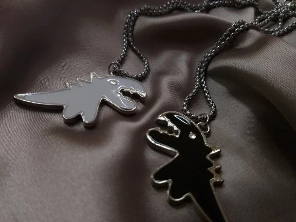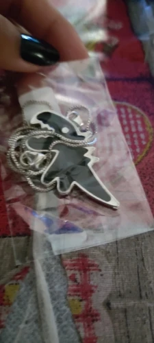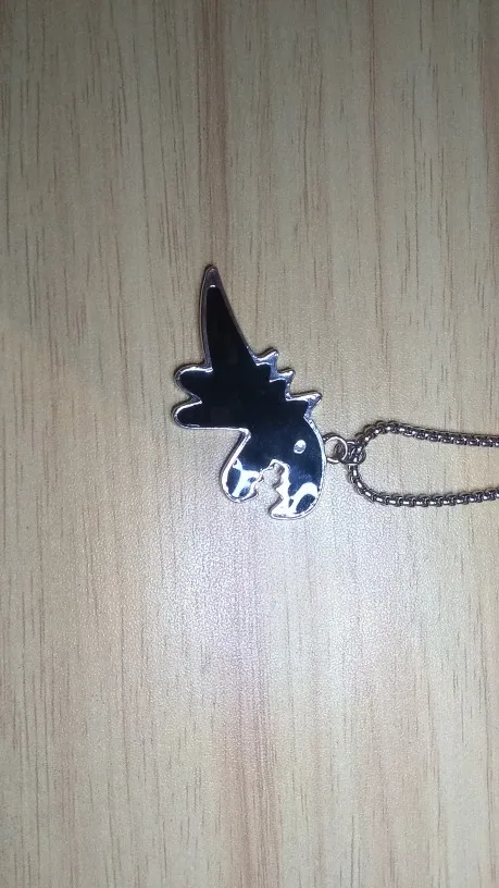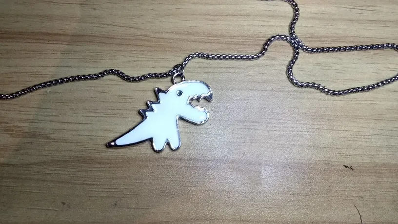 всё как в описании , динозаврик оформлен с двух сторон, это меня удивило , думала что будет как дешёвая бижутерия , но выглядит стильно и аккуратно . Всем советую . Доставка в Украину за 12 дней )