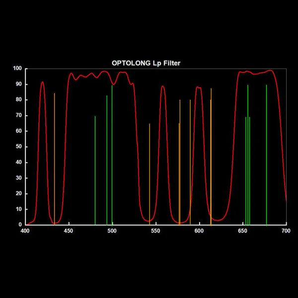 Высокий коэффициент пропускания при OIII (496нм и 500нм), Hβ (486нм), NII (654нм и 658нм), Ha (656нм) и SII (672нм).