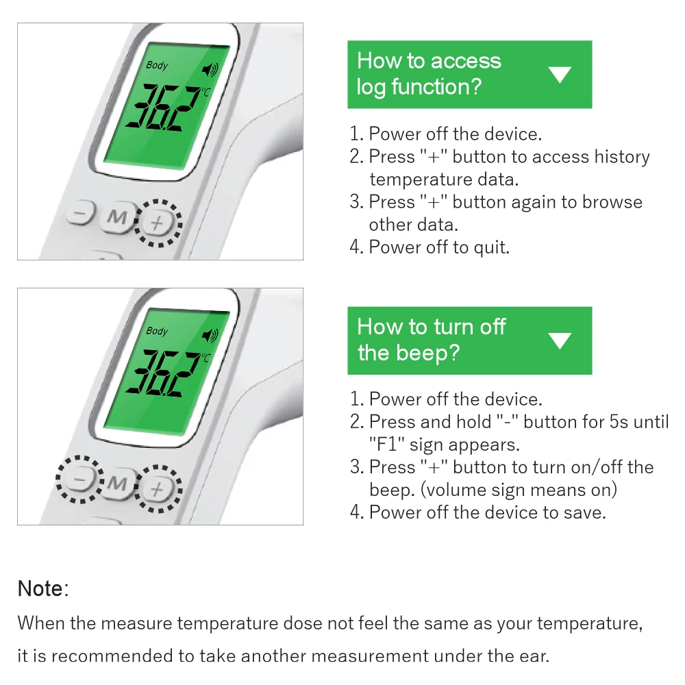 3. Интеллектуальный и гуманизированный дизайн: наш цифровой термометр может хранить и запоминать до 35 температурных показаний, что может помочь вам отслеживать изменения температуры. Через 15 секунд Смарт автоматически выключается. Инфракрасный термометр с температурой, оснащенный функцией предупреждения о лихорадке, поможет вам лучше понять состояние температуры и соответствующие огни и гудки.