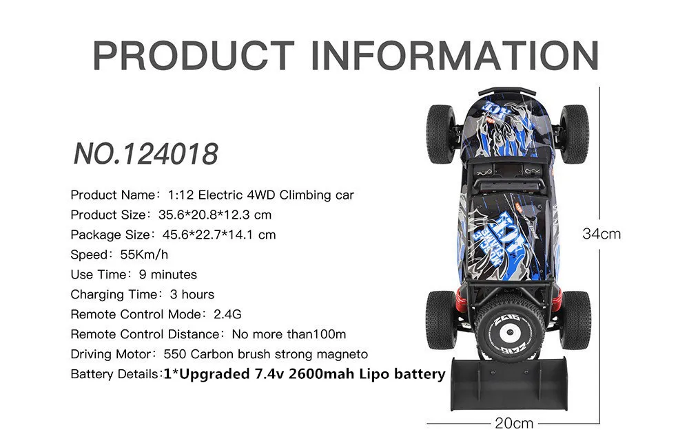 Бренд: WltoysНомер товара: 124018Масштаб: 1/12Цвет: синийМаксимальная скорость: 60 км/ч