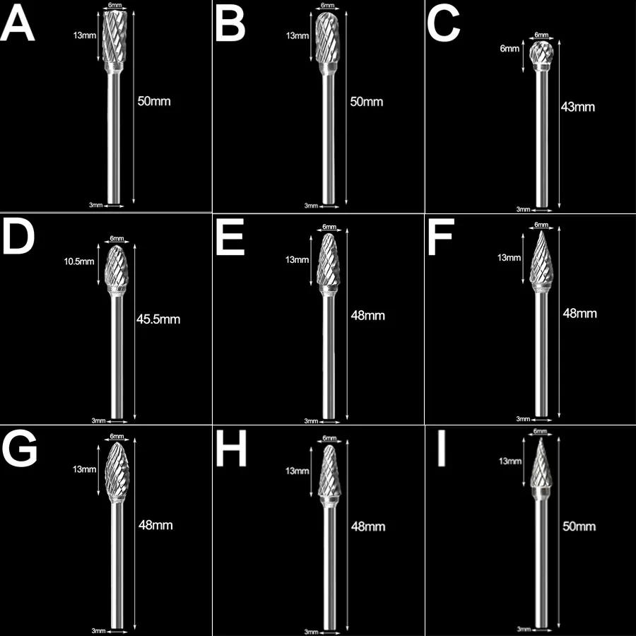Спецификация:* Цвет: серебристый (как показано на фото)* Материал: Вольфрамовая сталь* Диаметр хвостовика (прибл.): 3 мм (1/8 ")* Размер: как показано на изображении* Дополнительные модели: A,B,C,D,E,F,G,H,I,J