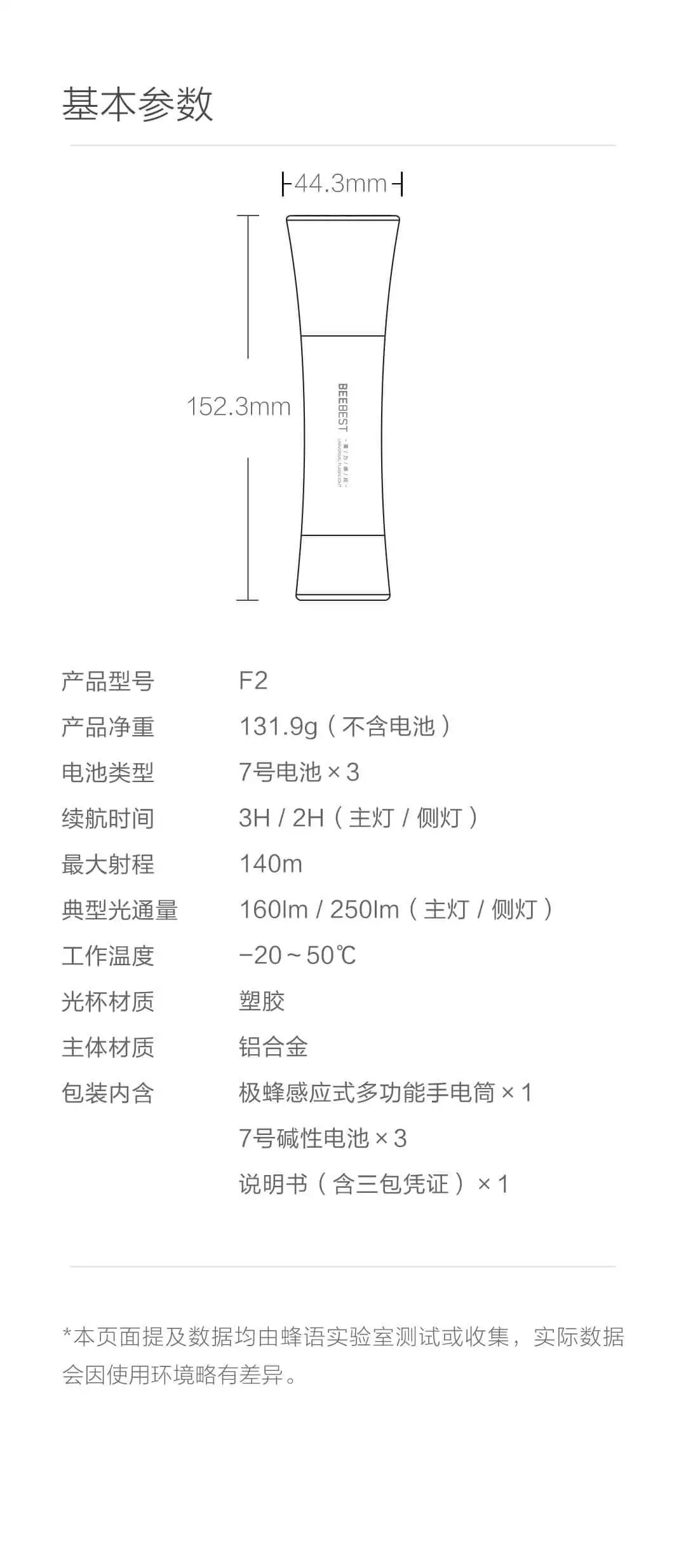 Бренд и модель: BeebestLED XP-G2Люмен: помещается Боком как фонарик: 250 лмРасположенный в вертикальном положении как ночной Светильник: 150 лмОн будет автоматически ощущать вертикальное и горизонтальное.Диапазон: размещен сбоку как фонарик: 140 мРасположенный в вертикальном положении как ночной Светильник: 10 лм (радиус)Он будет автоматически ощущать вертикальное и горизонтальноеБатарея: 3x AAA щелочная батарея (не входит в комплект)Рабочая температура: -20 ~ 50 ℃Отражатель: высококачественный гладкий отражательОбъектив: стекло с антибликовым покрытиемКорпус: алюминиевый сплавКнопка: задний переключательУдаропрочный 1,5 метровВодонепроницаемость: IPX7 может работать в дождяхЦвет корпуса: серебристыйВес: всего 131,9 гРазмер: 152,3 мм x 44,3 мм (Длина x Диаметр головки)