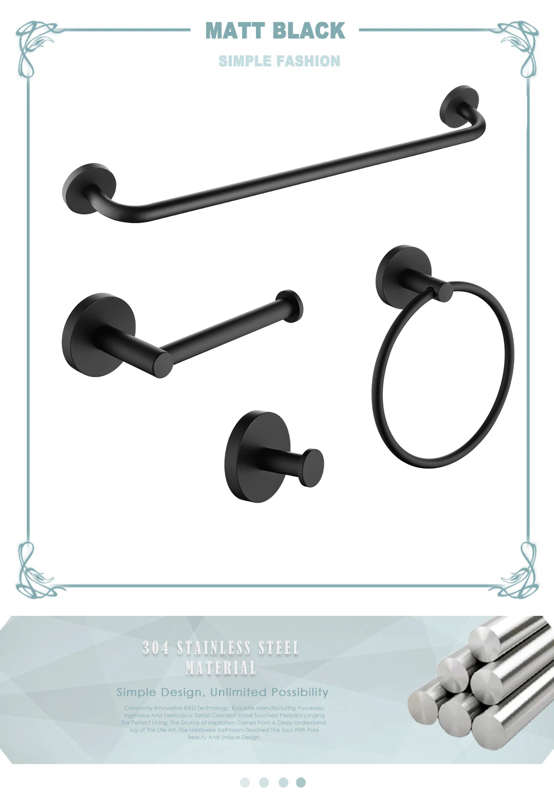 Особенности и характеристики:Набор оборудования для ванной комнатыКрючок для халата, бумажный держатель, полотенце бар, полотенце кольцоМатериал: нержавеющая сталь SUS304Цвет: матовый черныйИспользование: ванная комната/душевая комната/туалетТип: аксессуары для ванной комнатыУстановка: НастенныйВключая все монтажные фитинги