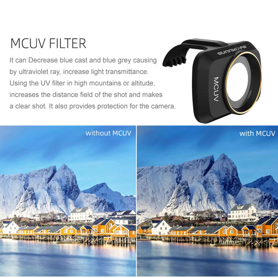 Может уменьшить синее и сине-серое оттенки, вызывающие ультрафиолетовые лучи, увеличивая коэффициент пропускания светильник. Использование УФ-фильтра на высоте или в горах увеличиваетПоле расстояния снимка и делаетЧеткий снимок. Также обеспечивает защитуДля камеры.
