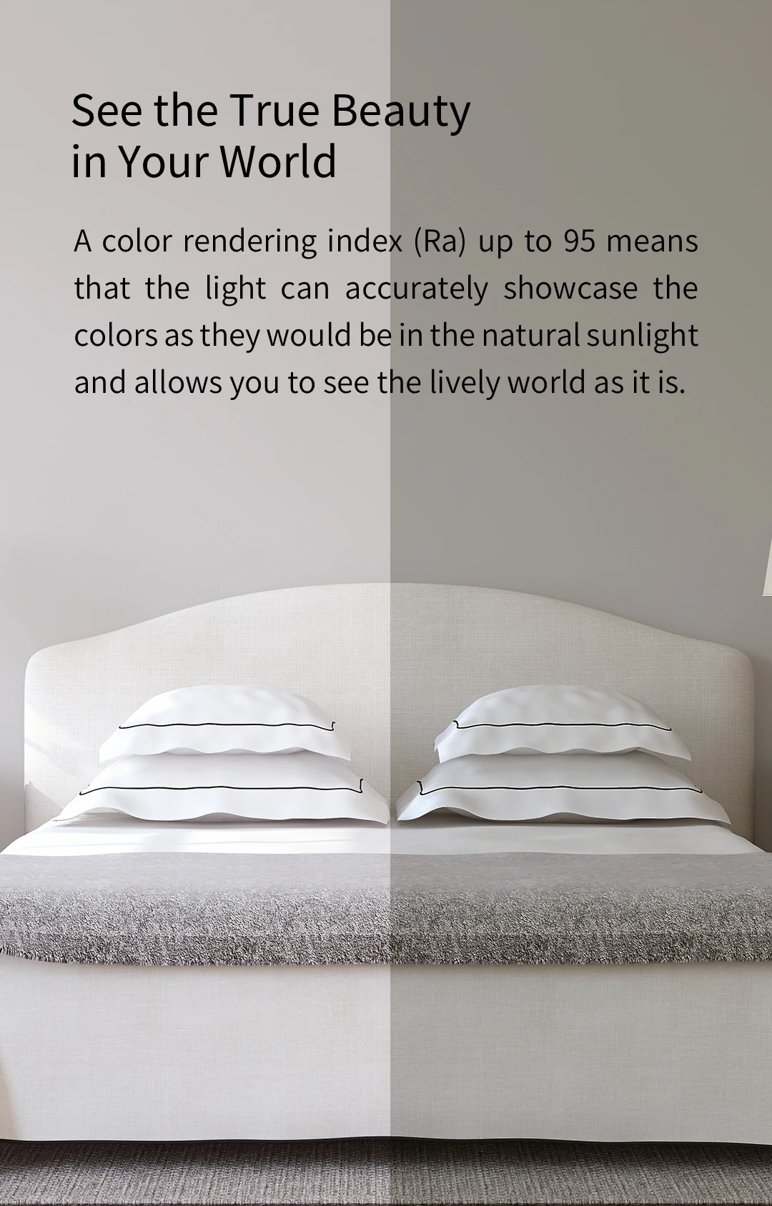 Индекс цветопередачи (Ra) до 95 означает, что светильник может точно отображать цвета, как они будут в естественном солнечном светильник, и позволяет видеть живой мир, как он есть.