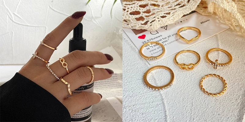 Комплект женских колец в винтажном стиле, кольца со звездой, сердцем и цепочкой на костяшки пальцев, с кристаллами и знаком бесконечности, 2021