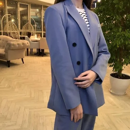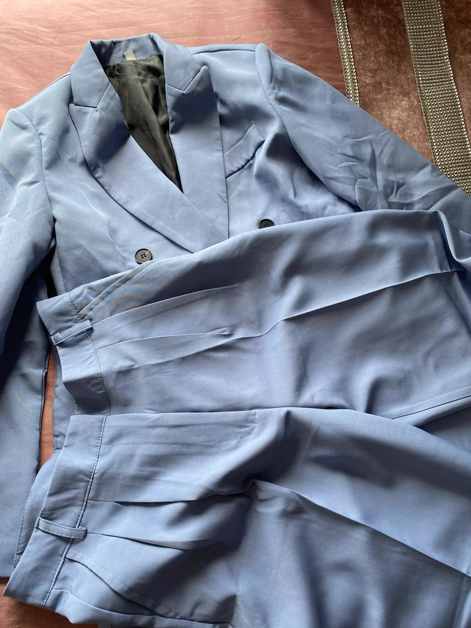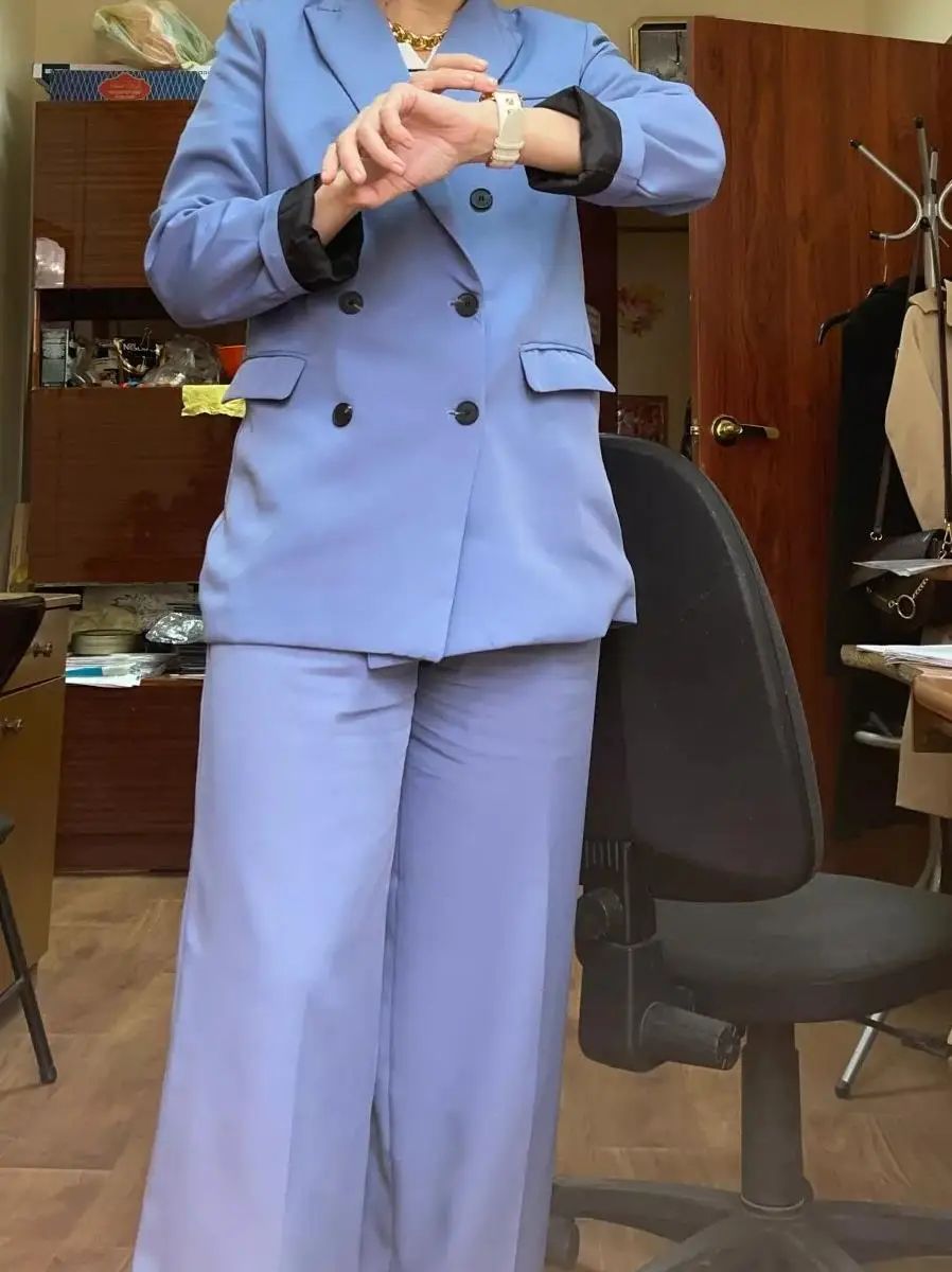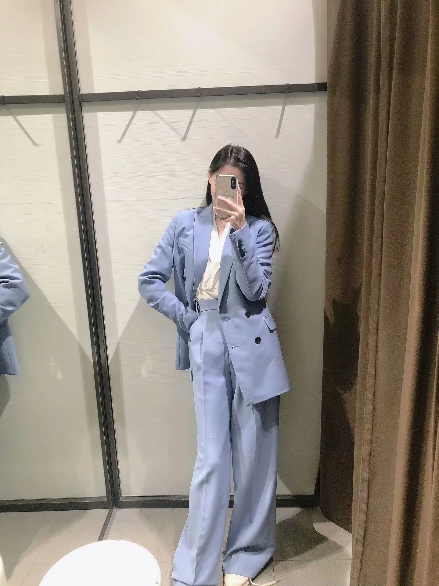 Женский костюм из двух предметов, голубой двубортный пиджак и повседневные Прямые брюки, Элегантная Модная шикарная одежда для весны, 2022
