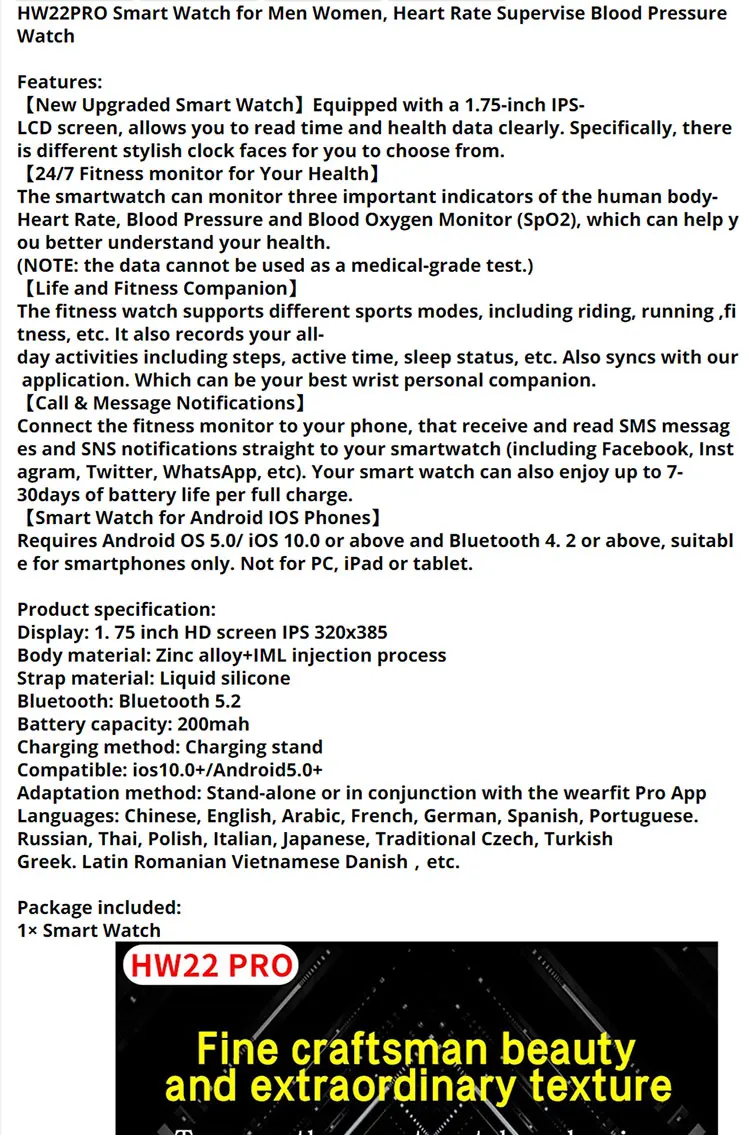 Оригинальные Смарт-часы HW22 для мужчин и женщин, экран 1,75 дюйма ...