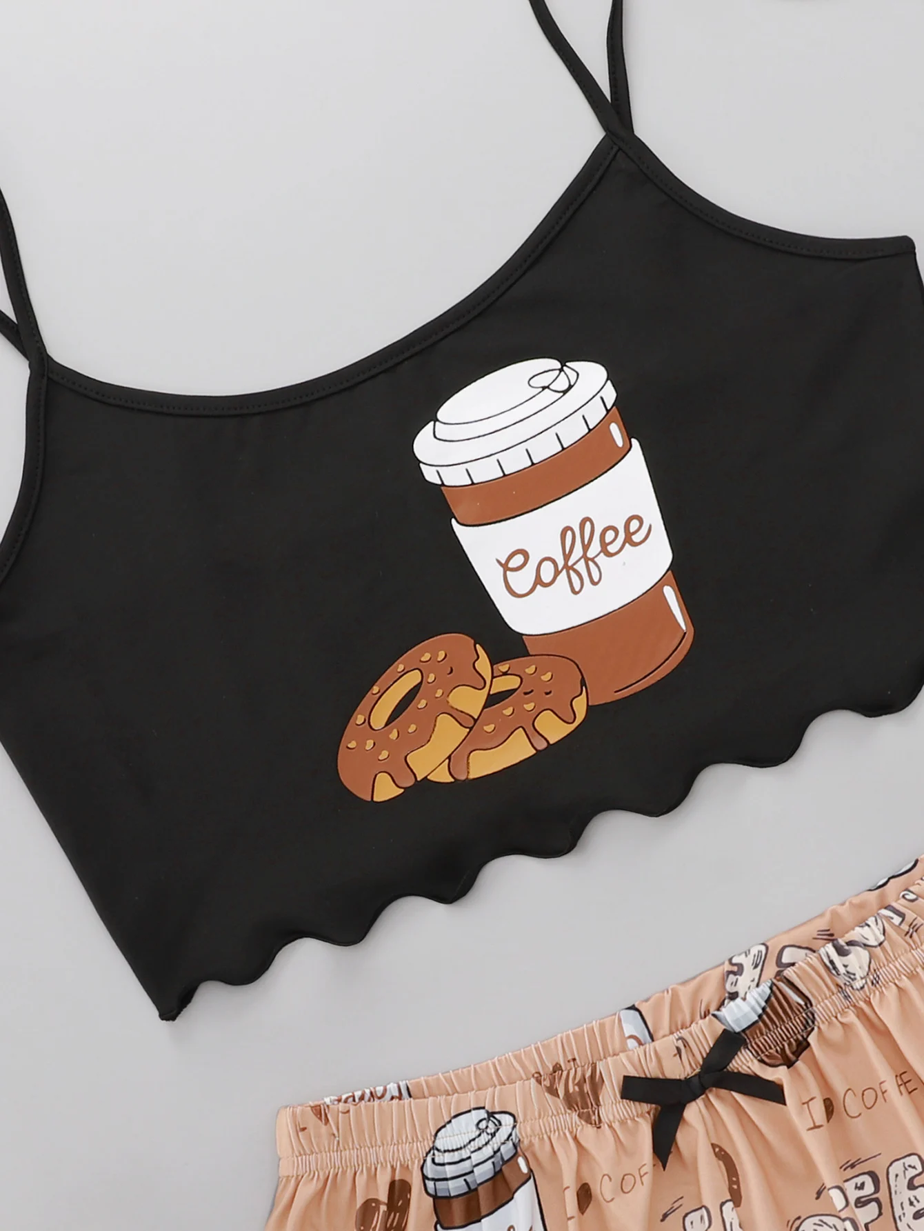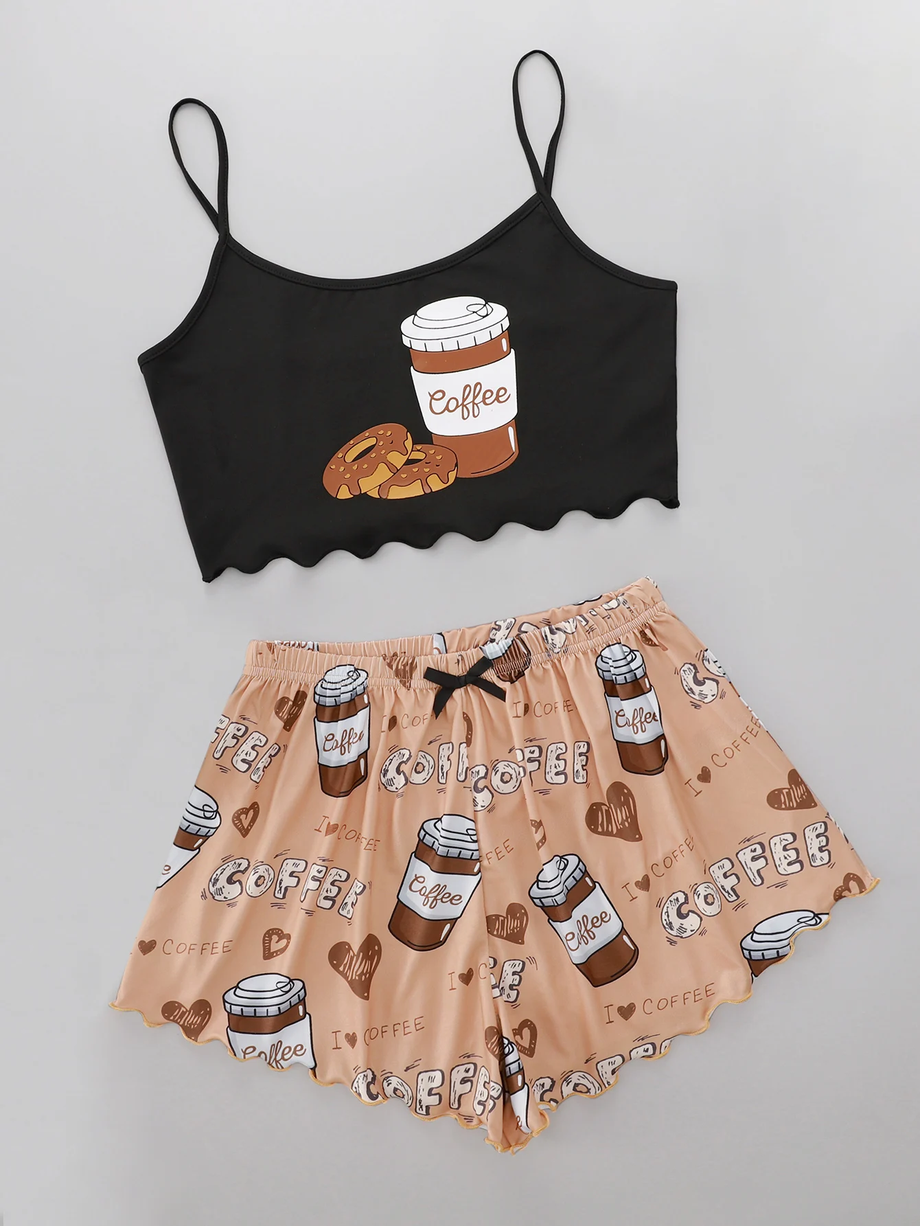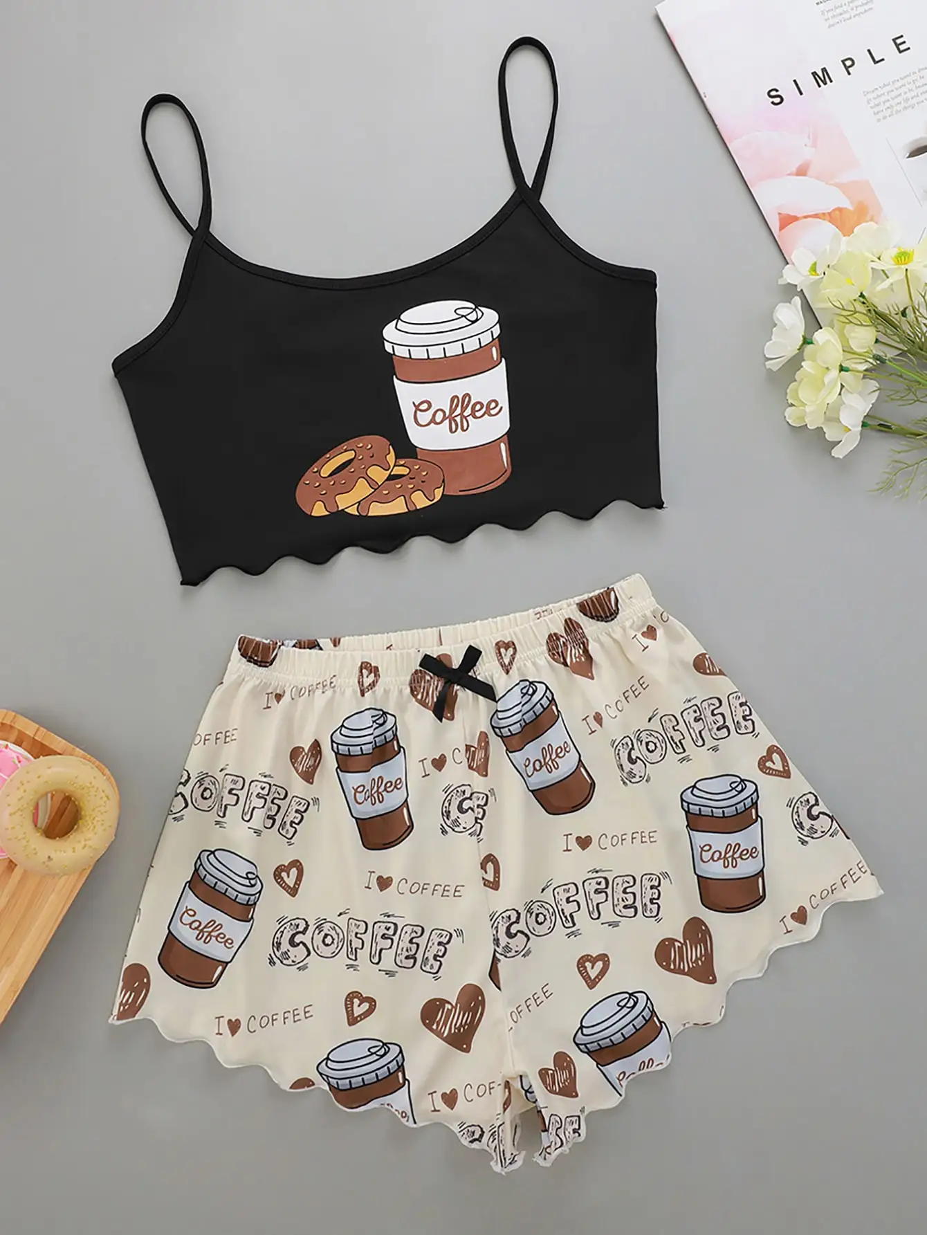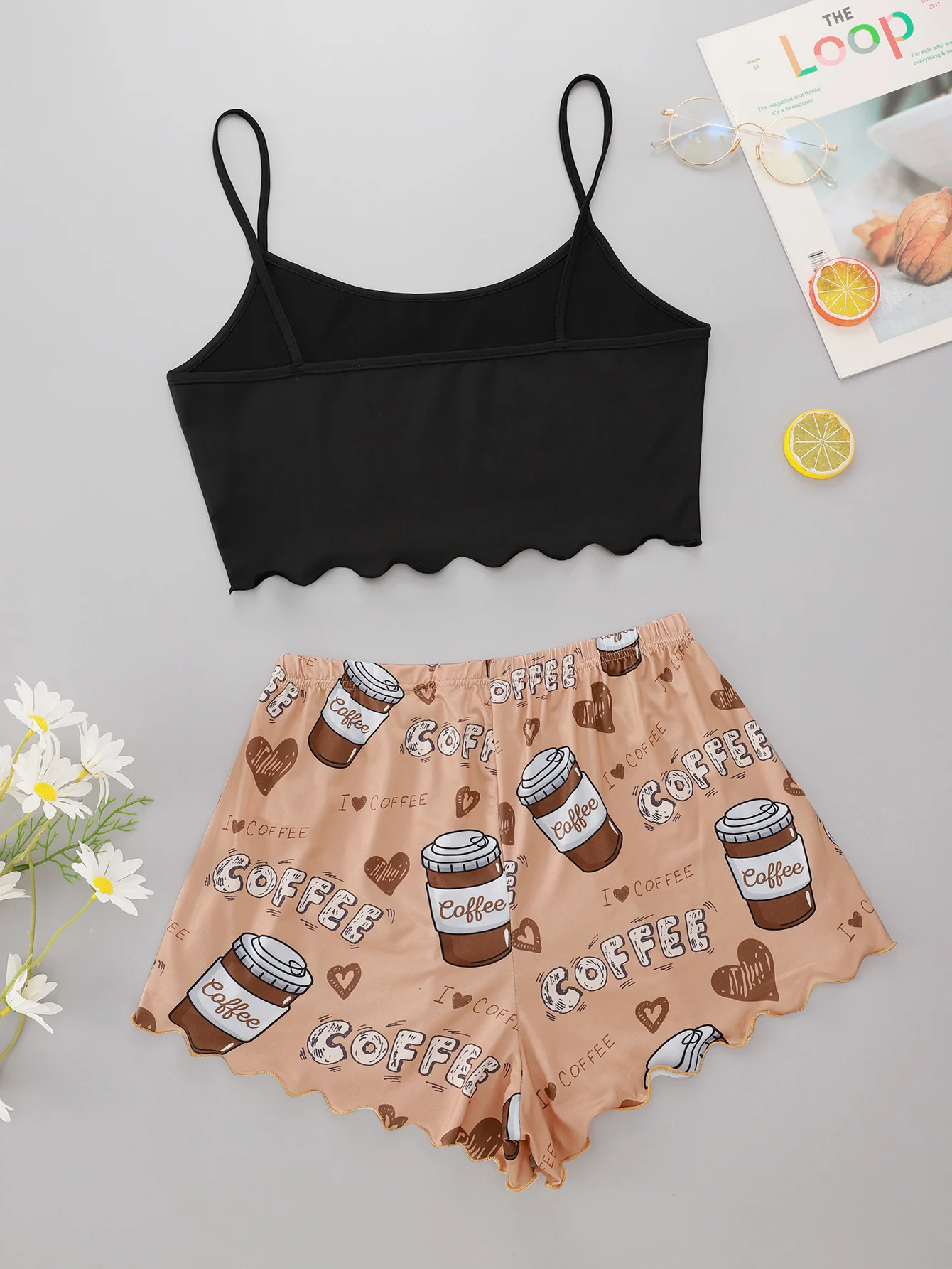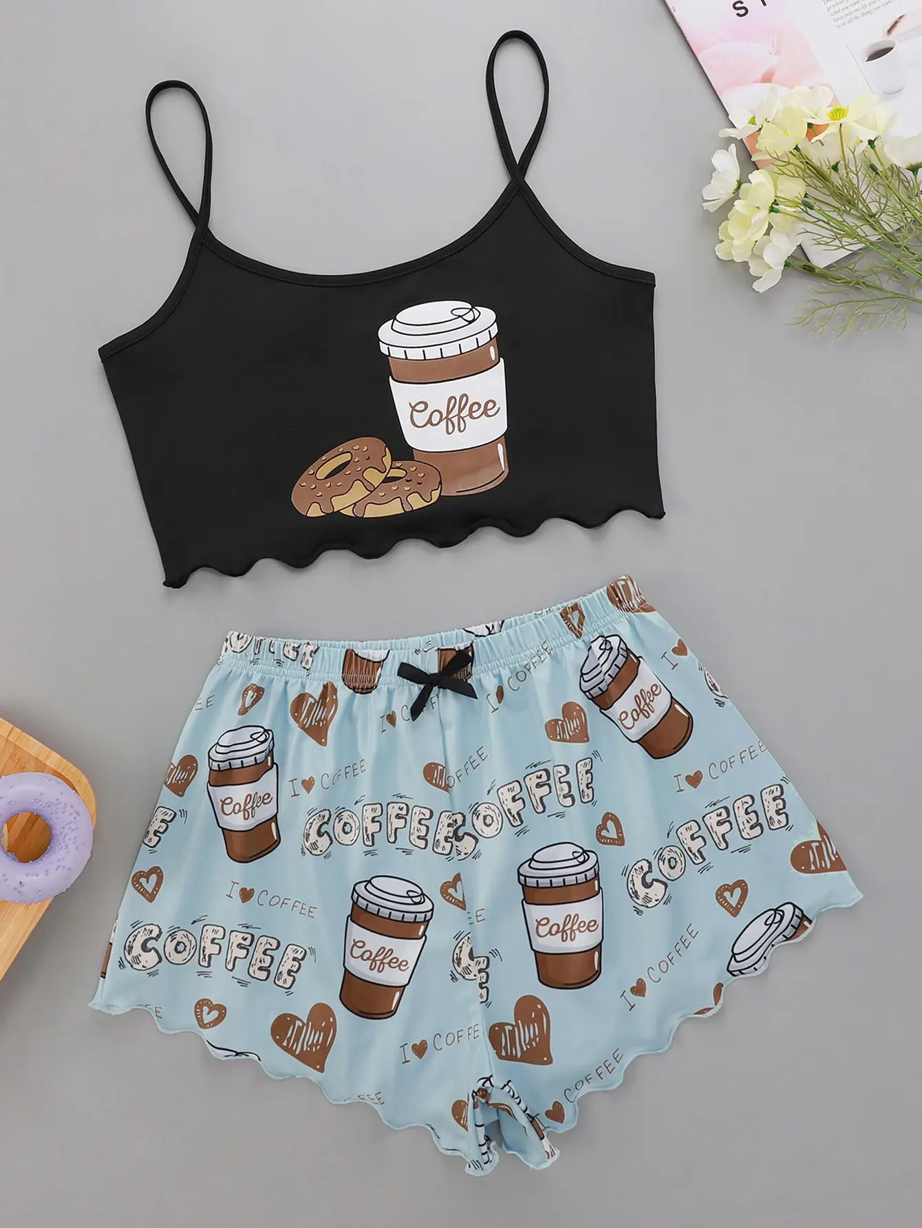 Сексуальный укороченный топ без рукавов жилет с эластичной резинкой на талии Короткие штаны пижамный комплект с героями мультфильмов Кофе майка с принтом с короткими рукавами, одежда для сна, домашняя одежда