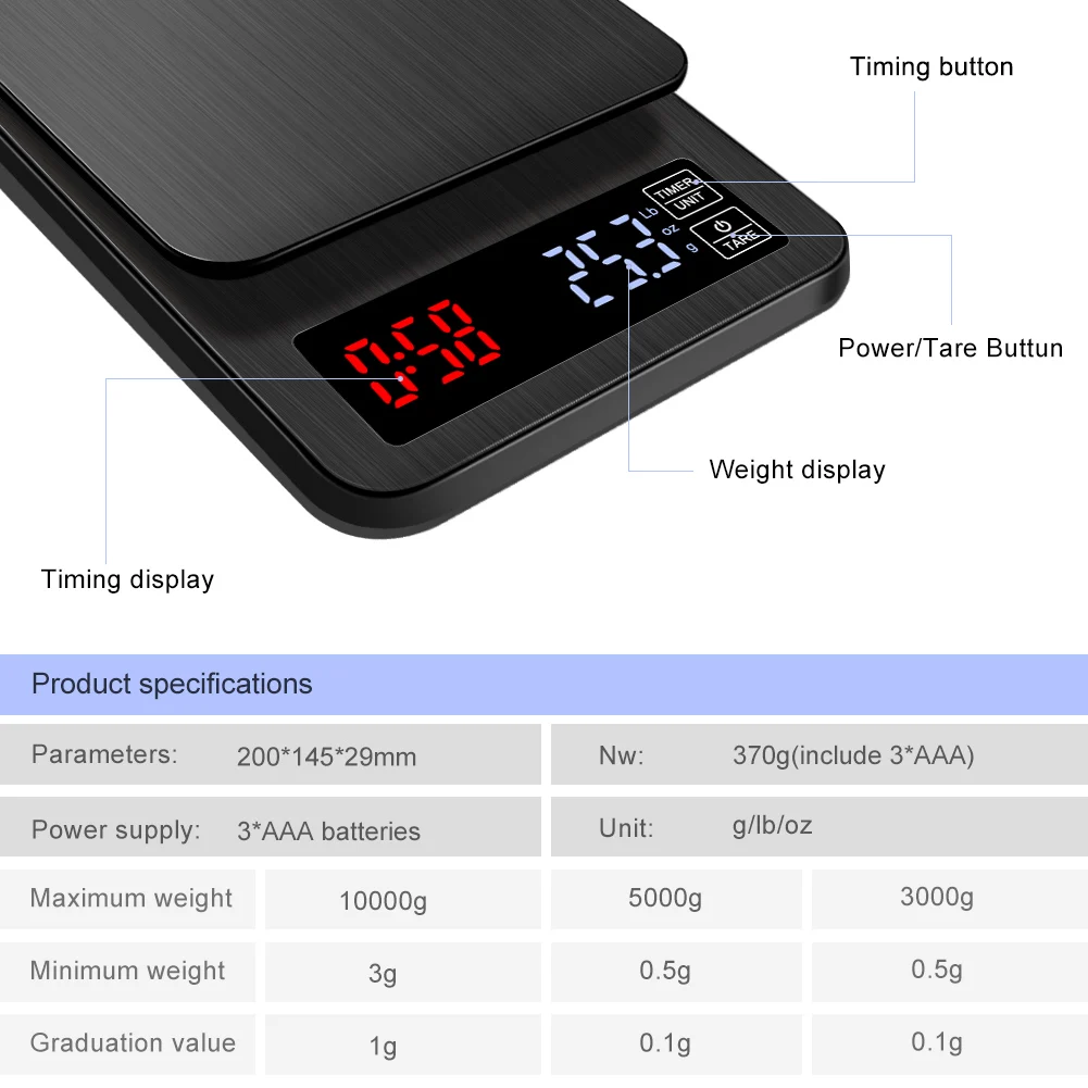 Цифровые электронные весы для кофе с таймером, 3 кг, 5 кг, 10 кг, 0,1 г