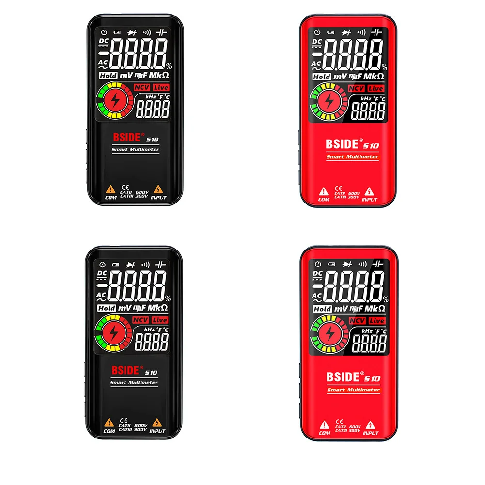 BSIDE S10 / S11 9999 отсчетов умный ЖК-цифровой мультиметр портативный AC DC NCV Тестер Вольтметр Амперметр Ом Напряжение Ток Сопротивление измеритель частотыХарактеристика:Продукты серии BSIDE S относятся к последнему поколению BSIDE бренда smart multimeters!Большой 3,5-дюймовый дисплей дизайн покинула мою превосходный пользовательский опыт для покупателей; Простой в использовании одной кнопкой переключения конструкция была признано покупателями; ультратонкий корпус очень легко носить с собой.Предоставьте 2 вида продукции на ваш выбор (S10 / S11).Изысканный внешний вид/надежная производительность/Полные функции могут удовлетворить потребности разных людей, и это очень подходит в качестве подарка.Спецификация:Дисплей: 9999Экран: 3,5 дюйм (ов)Напряжение постоянного тока: 0,8 V-620V ± (0.5% + 3)Разрешение: 0,001 вНапряжение переменного тока: 2,2 V-620V ± (0.5% + 5)Разрешение: 0,001 вСопротивление: 1Ω-999.9Ω ±(2.0% + 5); 1k60-60mΩ ±(1.0% + 3); Разрешение: 0.11ΩЕмкость: 1nF-999.9nF ±(6.0% + 5); 1uF-99.99mF ±(3.0% + 3); Разрешение: 0.001nFЧастота: 1 Гц-1000 Гц ±(1.0% + 5) (переменный ток: 2 в-10 В); Разрешение: 0,001 Гц1 кГц-60 кГц ± (1.0% + 5) (переменный ток: 10 В-620 В);Разрешение: 0,001 ГцРабочий цикл: 0.1%-99.9% ±(3.0% + 5) (переменный ток: 2 в-620 В);Разрешение: 0.1%Диод: в том случае, если она составляет менее 3,0 V, Диод будет идеальным решением для развертыванияV-оповещение (Бесконтактное Обнаружение напряжения): звуковой сигналПроверка в режиме реального времени: звуковой сигнал, ЖК-дисплейНепрерывность: если сопротивление меньше 30 Ом, звуковой сигнал будет звучатьИсточник питания: 1 * Li-Ion 800mAh/1,5 V (AAA) x 2 (не входит в комплект)Цвет: черный, красныйПримечание:В связи с различиями мониторов и эффектами освещения реальный цвет товара может немного отличаться от цвета на фотографиях. Спасибо!Возможны отклонения в 1-2 см вследствие измерений вручную.