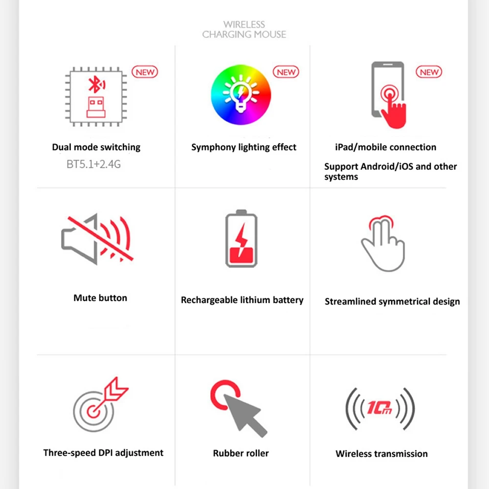 Модель продукта: компьютерная мышь RGB C7002Количество клавиш: 4 клавишиРабочее расстояние: 10 мМатериал: ABSDPI: 800/1200/1600Вес изделия: 70 гРазмер изделия: 112x57x27ммОсобенности продукта: эргономикаСрок службы кнопок: 5 миллионов разТип батареи: Встроенный аккумулятор 500 мАчСпособ подключения: подключение по Bluetooth/2,4 ГГц беспроводной связиЦвет: черный, серый, серебристо-серый, розовое золото2,4G Совместимая система: все компьютеры с интерфейсом USB могут быть использованыСовместимая система Bluetooth 3,0: Windows 7/8/10/XP, Android 3,0, Mac и IOS 10.X, ChromeСовместимая система Bluetooth 5,2: Windows 8/10, Android 4,2 и выше, Mac и IOS 10,10 (совместима с 4.2BLE, 4.1BLE, 4.0BLE или более ранними)